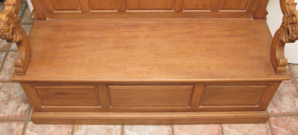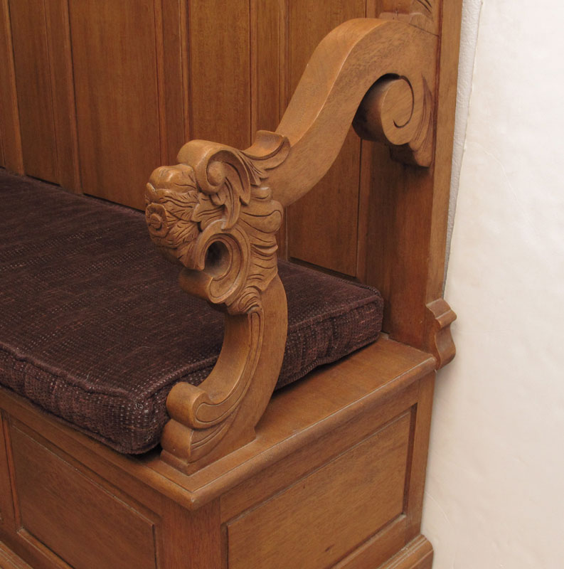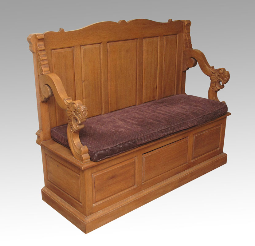 GOLDEN OAK BENCH WITH CARVED LION ARMS: High back bench with carved figural lion head arm rests. The center panel along the base is a secret drawer. Added upholstered removable seat cushion. 44 1/2'' h. x 57 1/2'' x 20 1/2''.