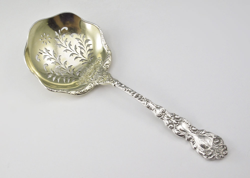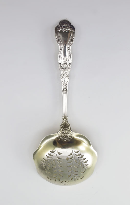 GORHAM IMPERIAL CHRYSANTHEMUM STERLING BON BON SPOON: Pierced vermeil bowl bon bon spoon by Gorham in the Imperial Chrysanthemum pattern. Monogrammed. Approx. 4.7 troy oz. 8'' long.