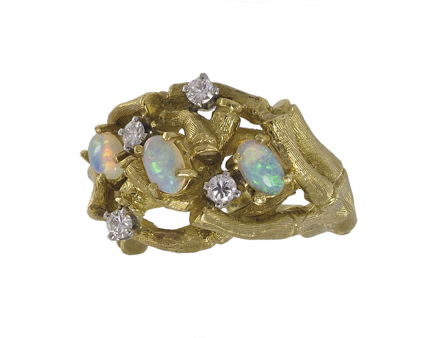 18K BAMBOO MOTIF OPAL & DIAMOND RING: 18K yellow gold ring contains three 5.00 x 3.00 mm oval cabochon cut opals. Blue/green play-of-color. Four round brilliant cut diamonds. Weight: .20 Ct. Approx. Rated VS in clarity and G-H in color. The opals and diamonds are prong set. Weight: 12.5 grams. Size: 6.