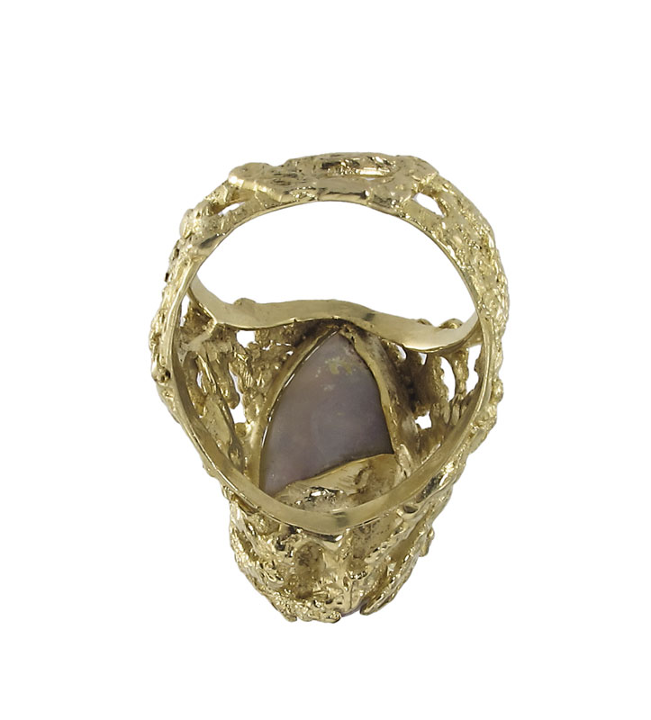 14K OPAL & DIAMOND RING: 14K yellow gold lacy nugget ring contains one 20.00 x 9.00 mm opal. The opal is crazed. Three round brilliant cut diamonds. Weight: .08 Ct. Approx. The diamonds average VS in clarity and L-M in color. The opal and diamonds are prong set. Weight: 10.6 grams. Size: 7.5