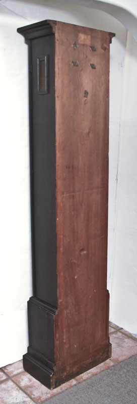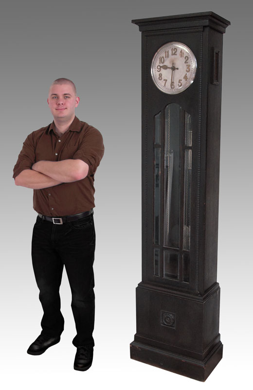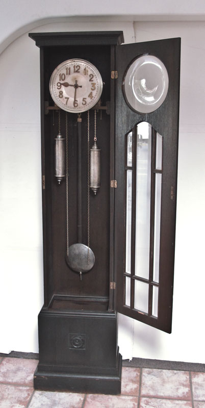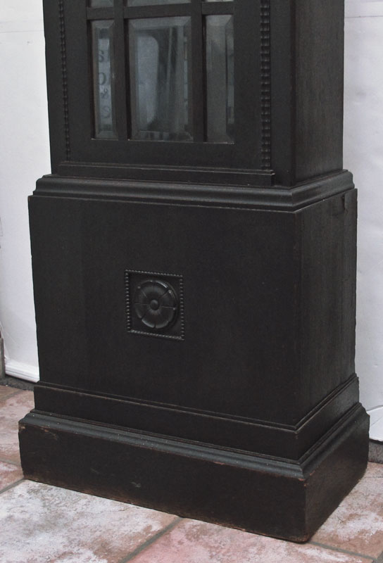 GERMAN DECO OAK GRANDFATHER CLOCK: Dark stained oak case with paneled beveled glass front. Silvered dial with raised Arabic numerals, unmarked time and strike movement. 79 1/2'' h. x 20'' x 11 1/4''.