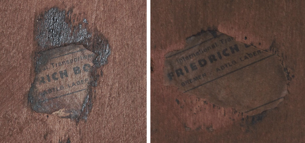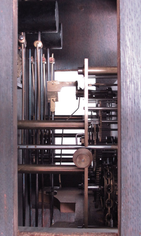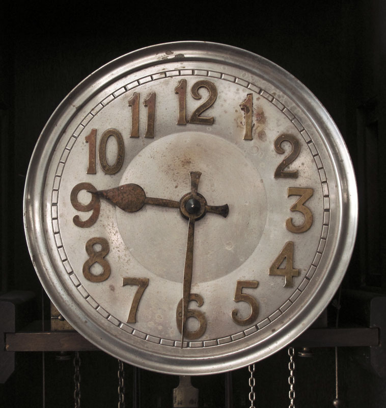 CONDITION: Note scrapes and dings to base, tarnish on dial. One hammer has come off, missing one downward striker, we have the hammer. One replacement weight.