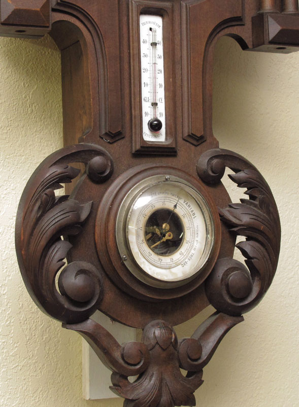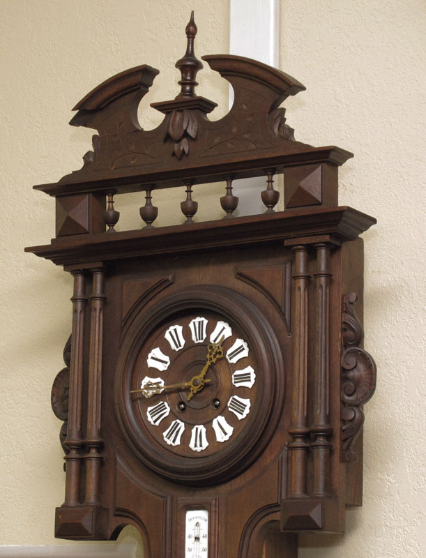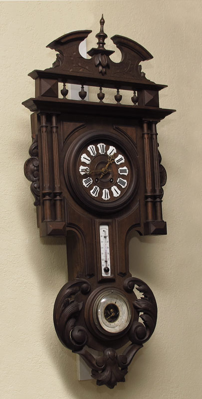 FRENCH CARVED WALL CLOCK WITH THERMOMETER AND BAROMETER: Carved pediment with spire final over carved case with double full column supports and carved foliate scroll. Key wind and pendulum time and strike movement. Enamel Roman numeral cartouches on face, enamel plate on centigrade thermometer, non functioning aneroid barometer lower. No key. 38 1/4'' h. x 16 1/2'' x 6''.
