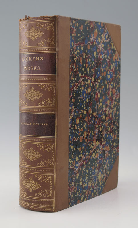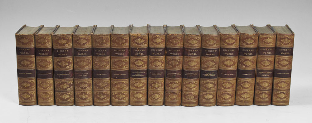 LATE 19TH CENTURY 15 VOLUME SET CHARLES DICKENS BOOKS: 15 volumes published by DeWolfe, Fiske & Co. Boston of Charles Dickens works. 3/4 Tan leather with marbled boards and page ends. Each approx. 1 7/8'' x 7 1/2'' x 5 1/4''