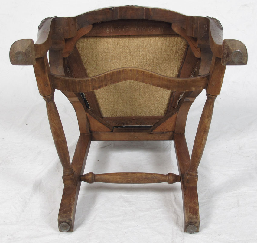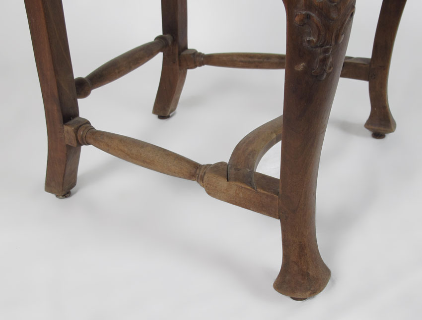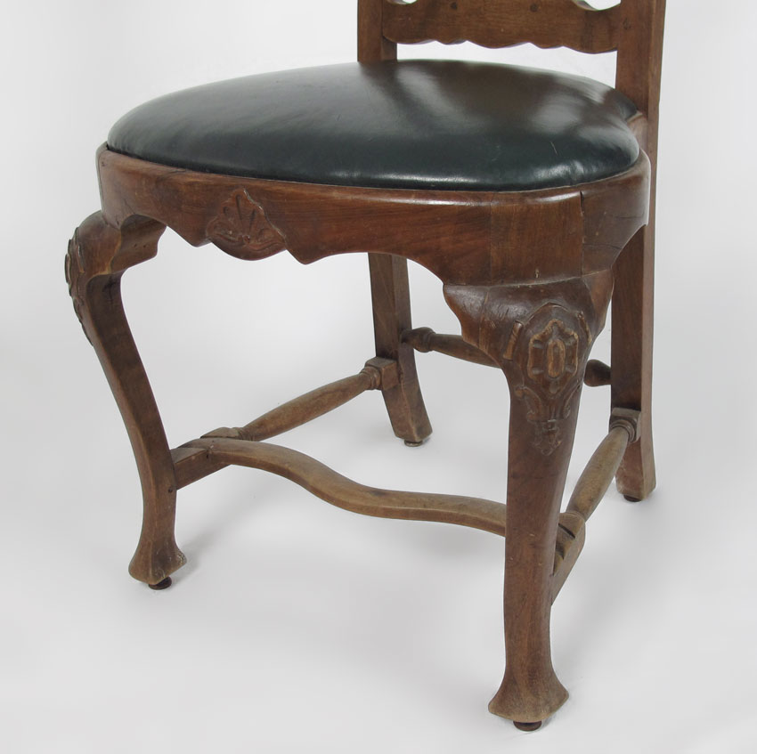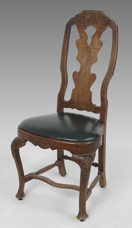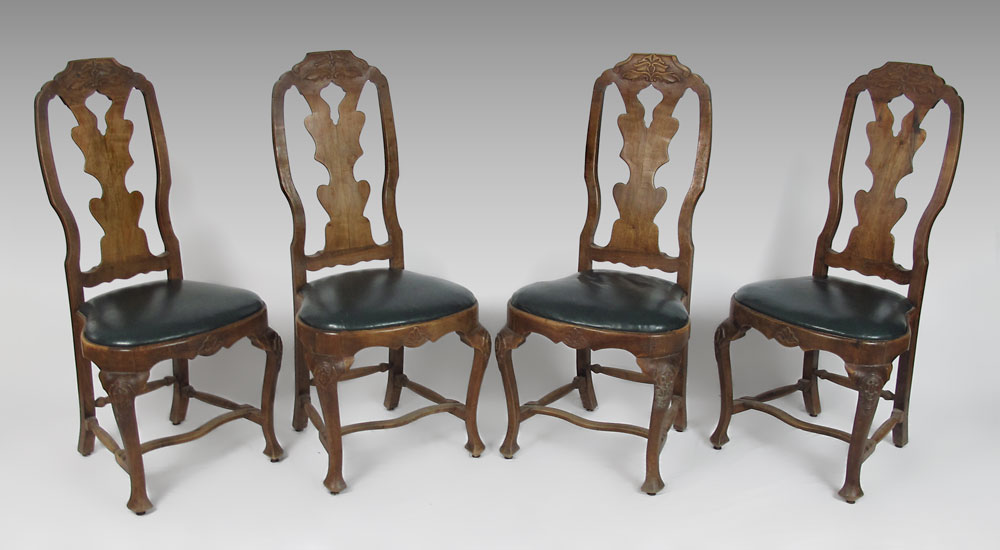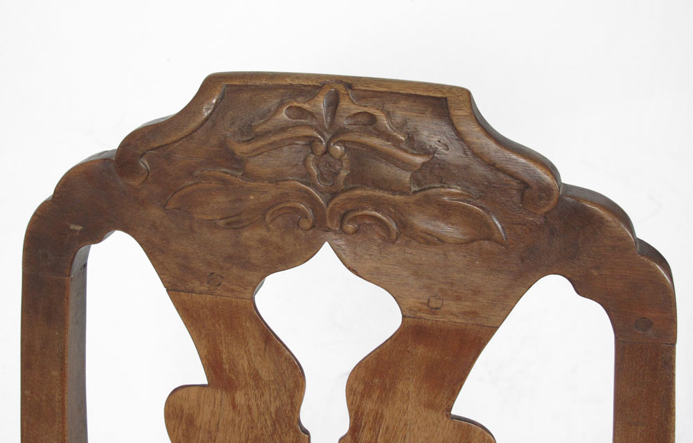 SET OF 4 EARLY CARVED SIDE CHAIRS: Pegged construction, carved top rail and knees, slightly bowed vertical splat, rounded seat. 42 1/4''h. back, 19''h. seat, 20''w. x 16''d.