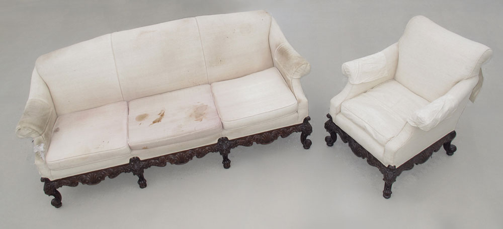 SUPERBLY CARVED MAHOGANY SOFA AND CLUB CHAIR: Carved skirt and feet. Sofa 37 1/4'' h. x 88 1/2'' x 35''. Chair 36 1/2'' x 34'' x 37''.