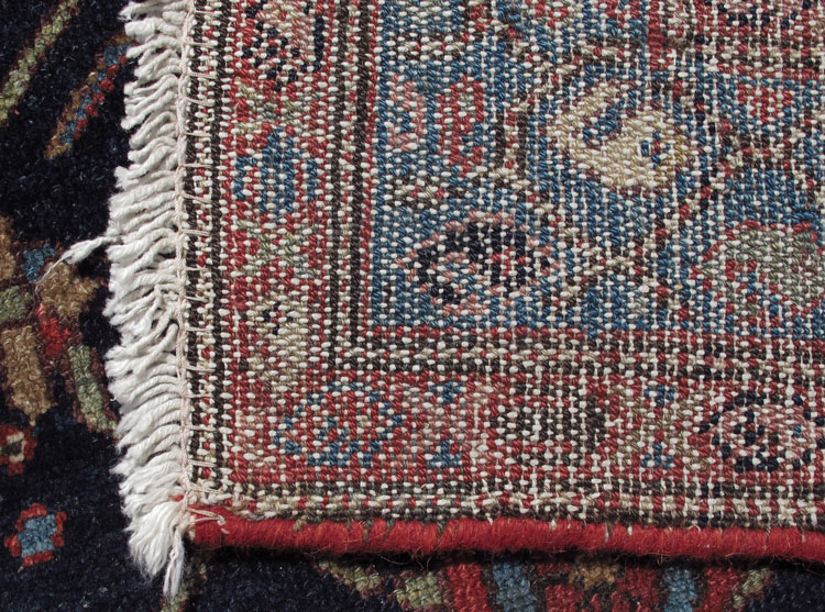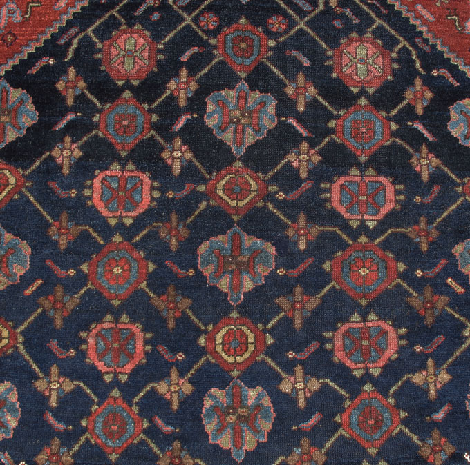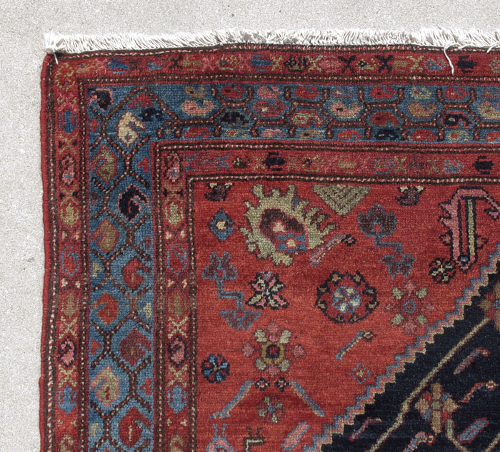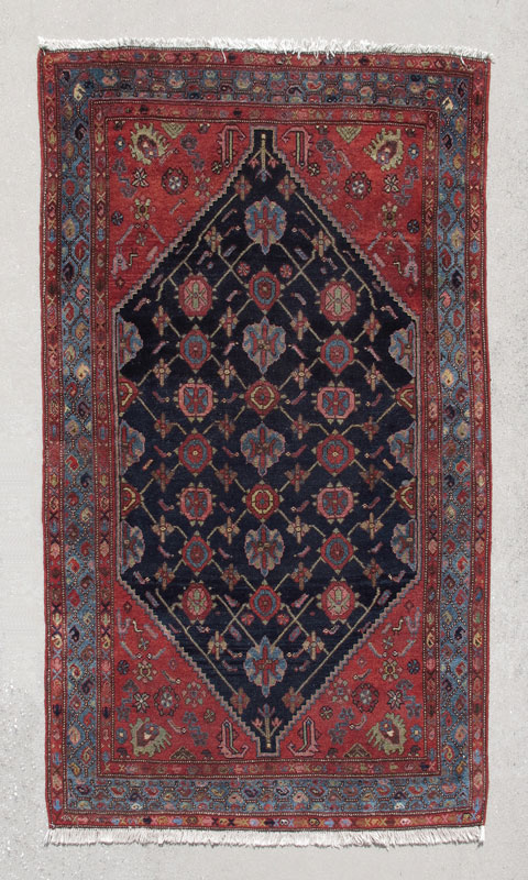 APPROX. 90 YR. OLD PERSIAN MALAYER HAMADAN HAND KNOTTED WOOL RUG, 4' 2'' x 6' 3'': This lovely tribal rug has a strong design with a deep blue central field that is covered with a lattice work of vines linking stylized flowerheads in colors of peach, brick rust, and med. blue. The honeycomb design of the main border with small botehs in each panel is an interesting frame to complete the picture that is this rug. Condition is good.