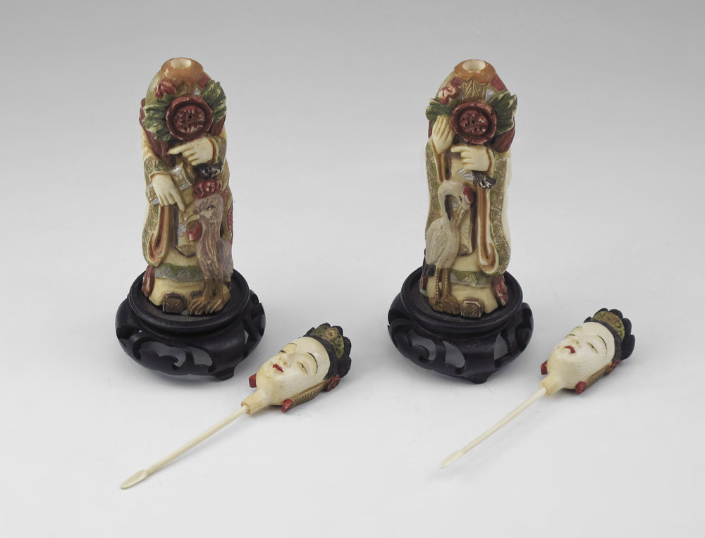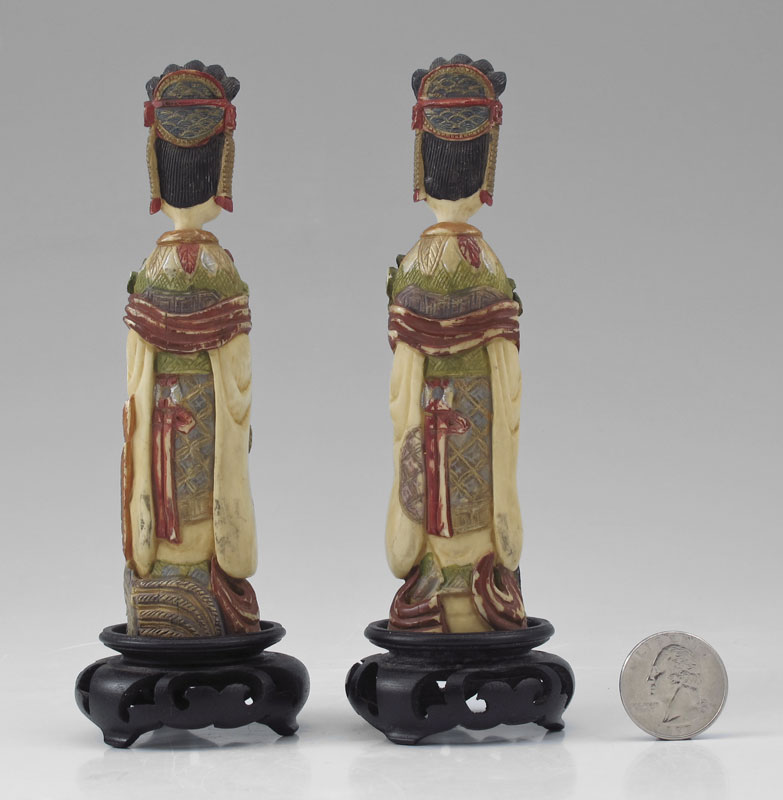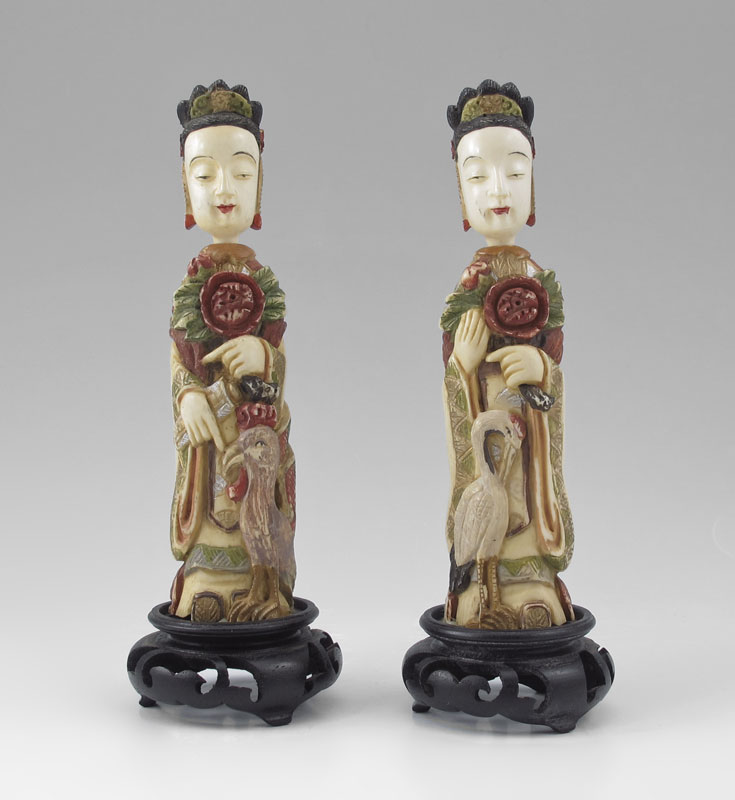 PAIR LARGE POLYCHROME CARVED IVORY SNUFF BOTTLES: Larger than most figural carved ivory snuff bottles of women with flowers and birds. Polychrome decoration, 5 1/4'' h. Both affixed to carved wood stands, overall 6 1/4'' h.
