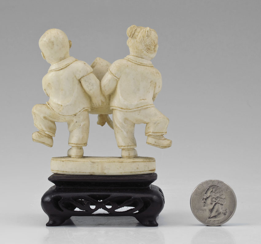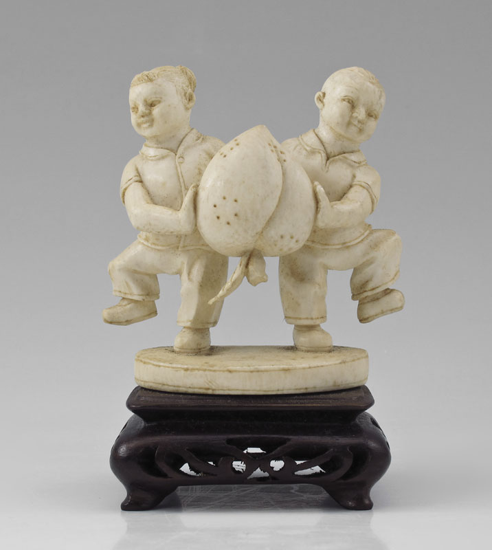 CHINESE CARVED IVORY FIGURAL GROUP: Figure of 2 children holding a peach. 3 1/4'' h. affixed to carved wood base, 4 1/8'' h. overall.