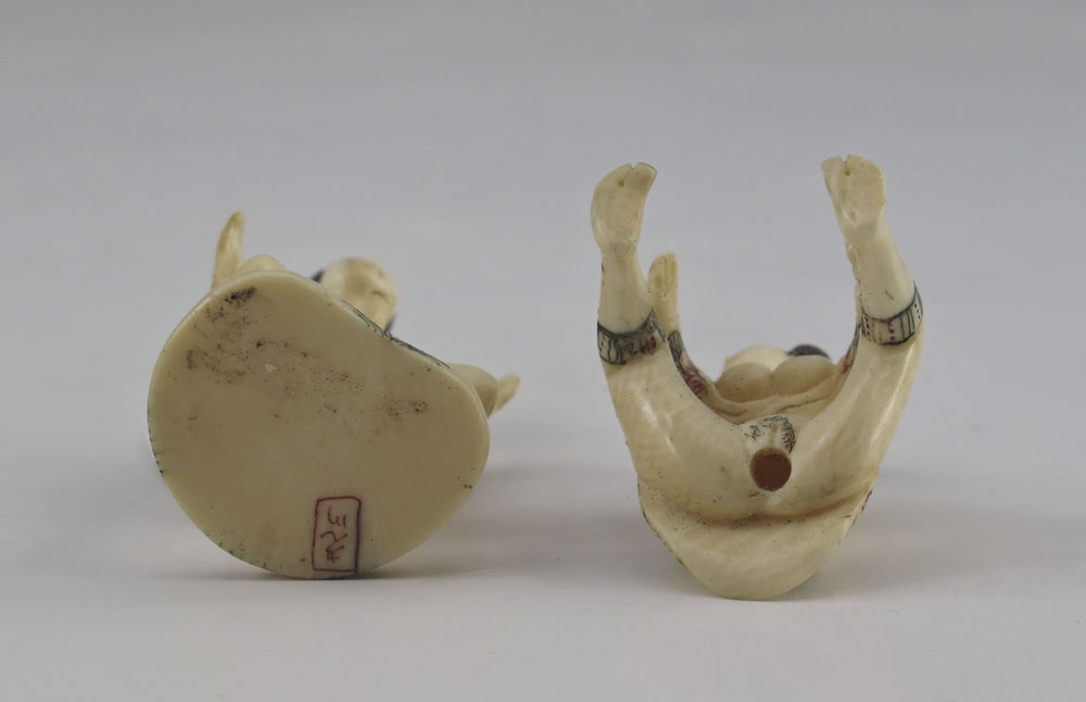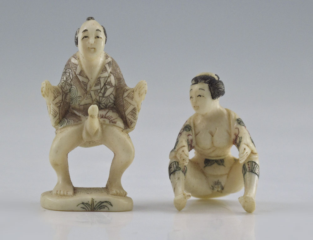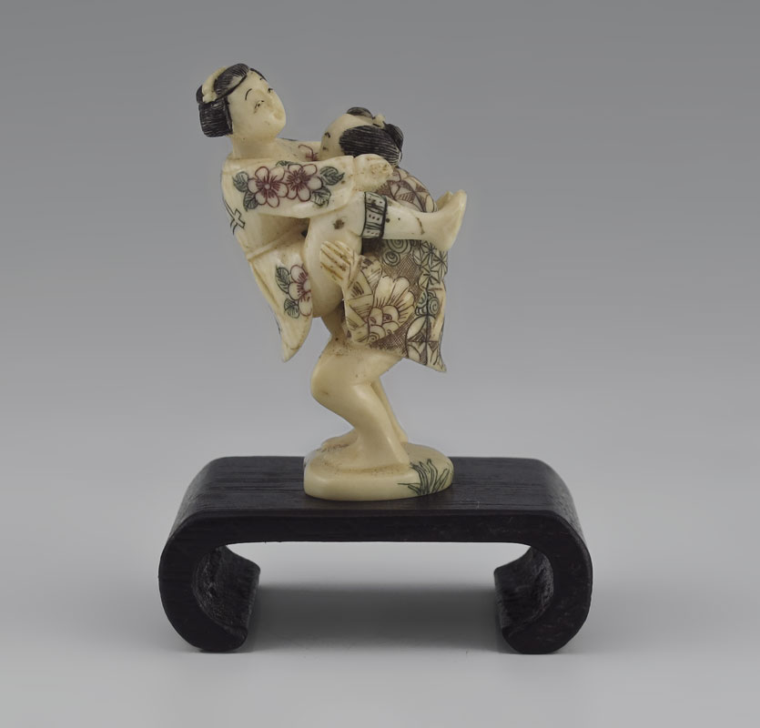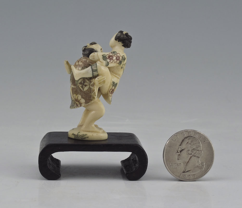 JAPANESE CARVED IVORY EROTIC FIGURAL GROUP: Miniature male and female figure in concupiscent pose, with woman separating from man. Signed on base, 2'' h.. Sold with wood base, 3/4'' h.