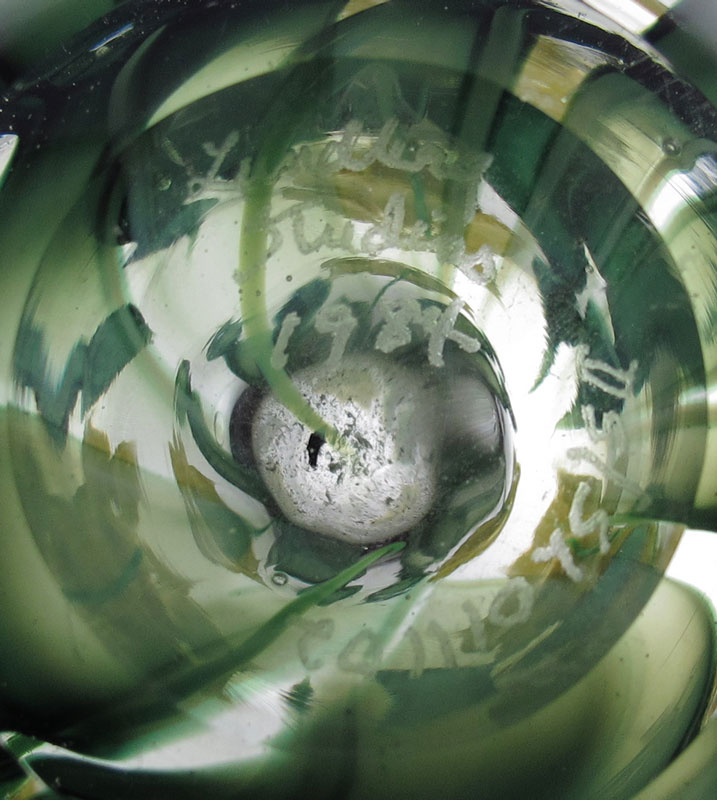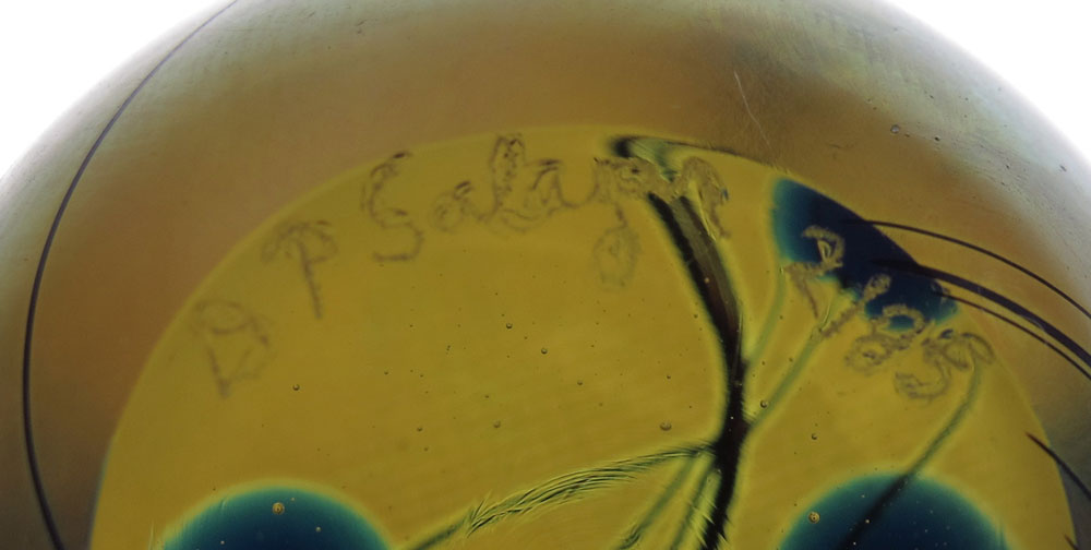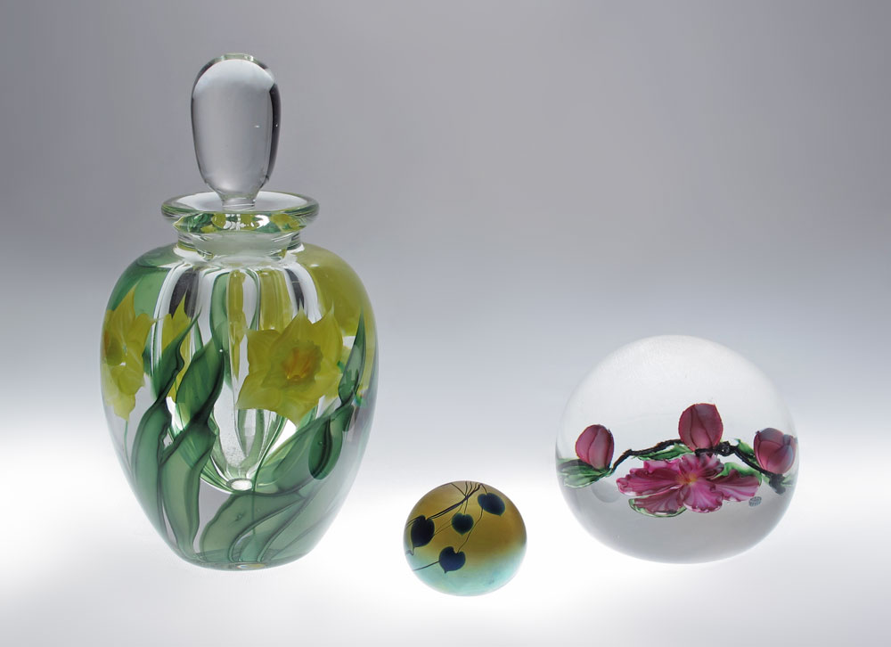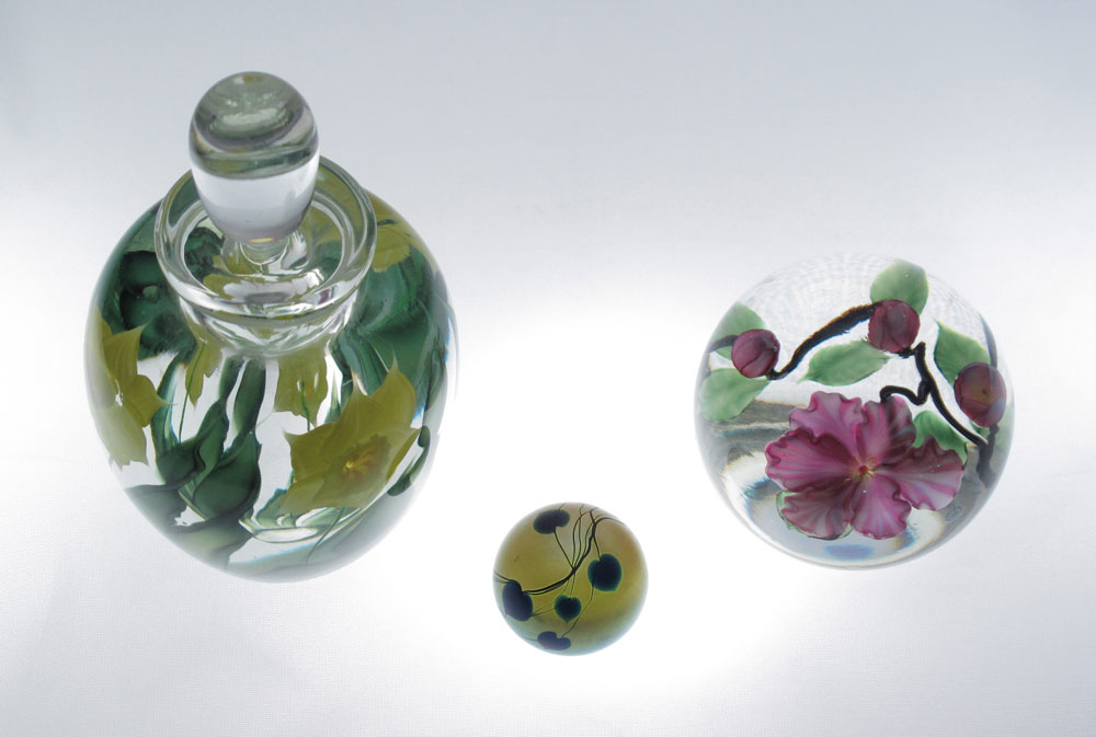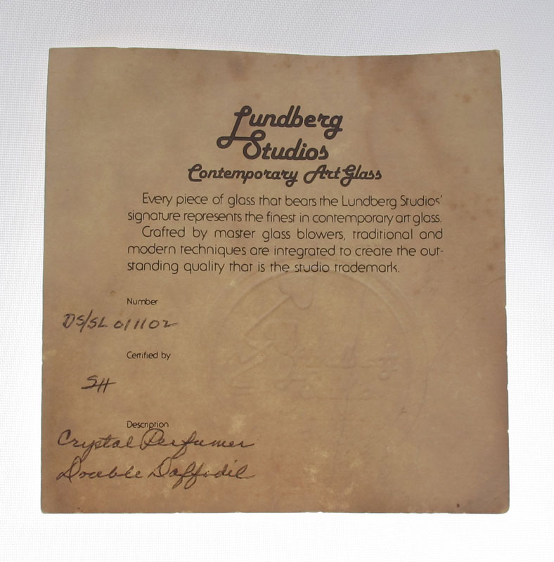 3 PIECE SALAZAR LUNDBERG PAPERWEIGHTS / PERFUME: 1) 1.5'' miniature iridescent glass weight in heart vine design, incised BP Salazar 2/85. 2) Pink floral signed David Salazar Lundberg Studios 1985 1121/8. 3'' dia. 3) Double Daffodil design paperweight perfume bottle, signed Lundberg Studios 1984 DS/ SLO11102. 5.75'' tall.