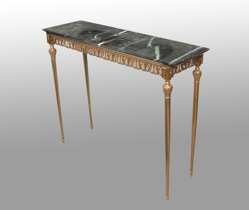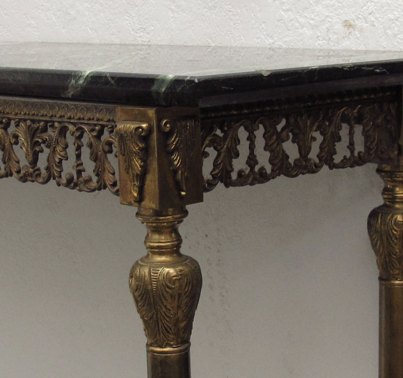 MARBLE TOP HALL TABLE: Darkest green marble over reticulated brass apron and slender tapered legs. Approx. 32 1/2'' x 40'' x 12''.