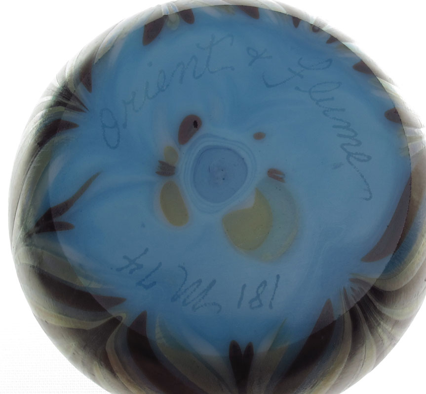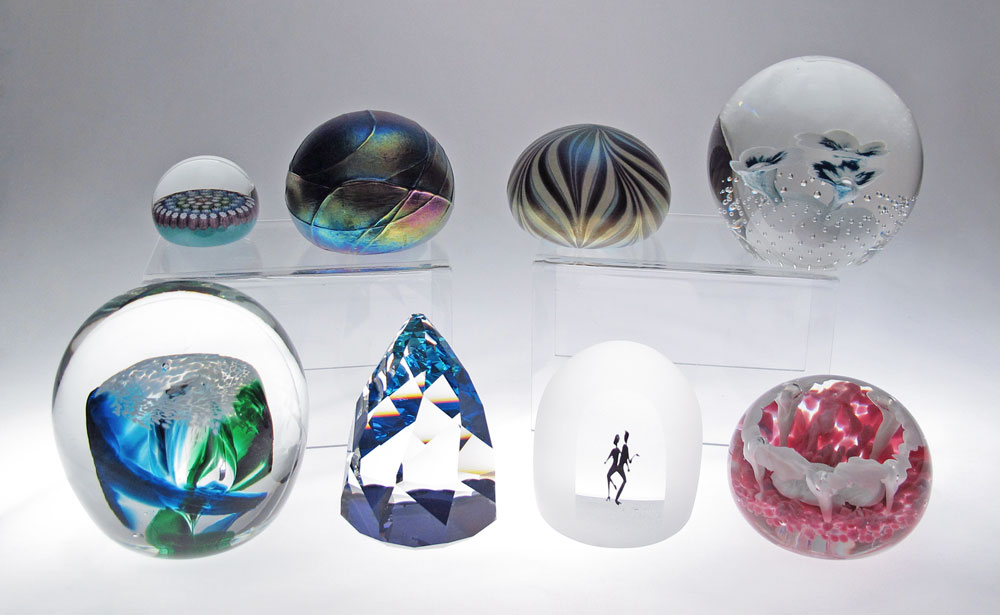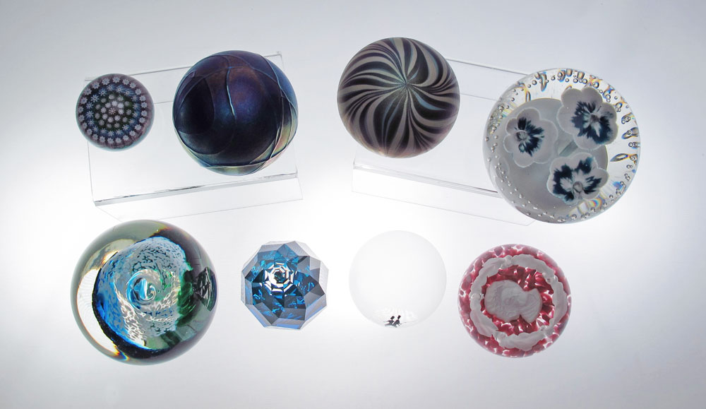 8 ASSORTED PAPERWEIGHTS: Collection to include signed color changing faceted cone shaped Perthshire, signed Orient & Flume iridescent, a threaded and deep iridescent signed only OBG. illegibly signed silhouette, St. Clair sulphide, the largest is the Irish Jerpoint, 3 1/2'' tall. The smallest is a caned weight, 1 3/4''.