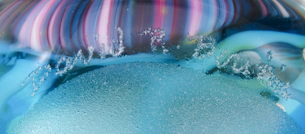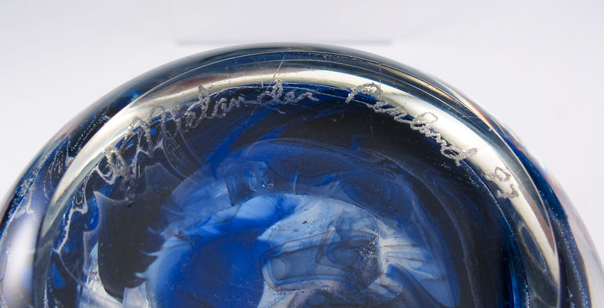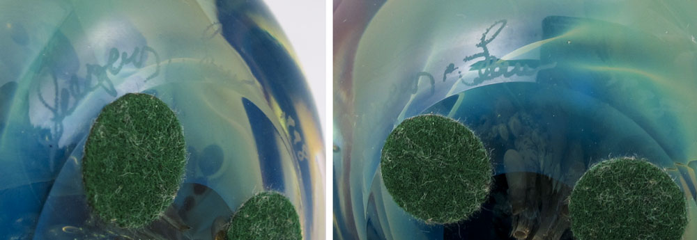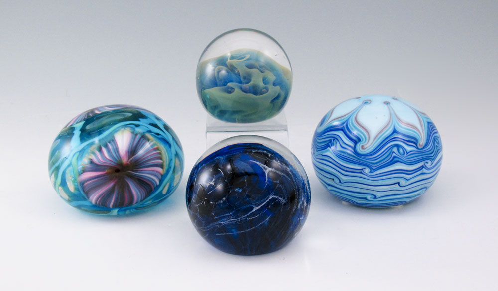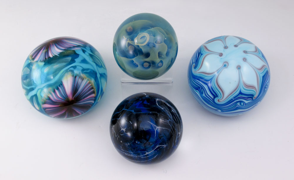 4 SIGNED ART GLASS PAPERWEIGHTS: Colors of the sea and sky. All illegibly signed. 2 1/4'' dia. - 3'' dia.