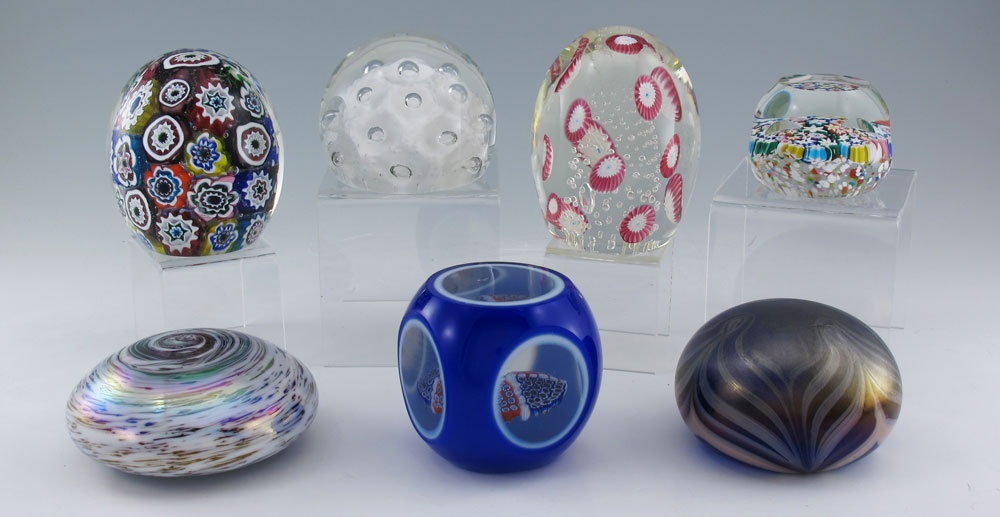 COLLECTION OF 7 GOOD ART GLASS PAPERWEIGHTS: Millefiori, cane, iridescent art glass, and bubbles. 2'' dia. - 3 3/4'' tall. Unsigned.