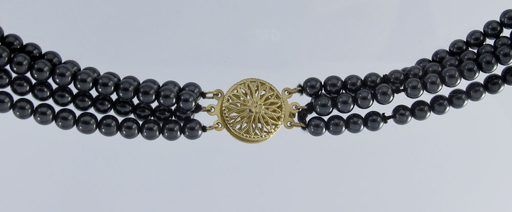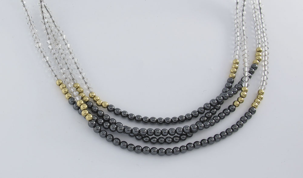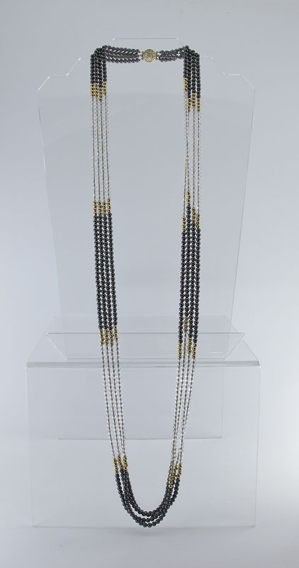 A 38'' BEAD NECKLACE OF 14K GOLD, HEMATITE AND CRYSTAL: 38'' four strand necklace with cut crystal hematite, and 3.75 mm 14K gold beads and 14K filigree clasp. Gold weight: 14.8 grams approx.