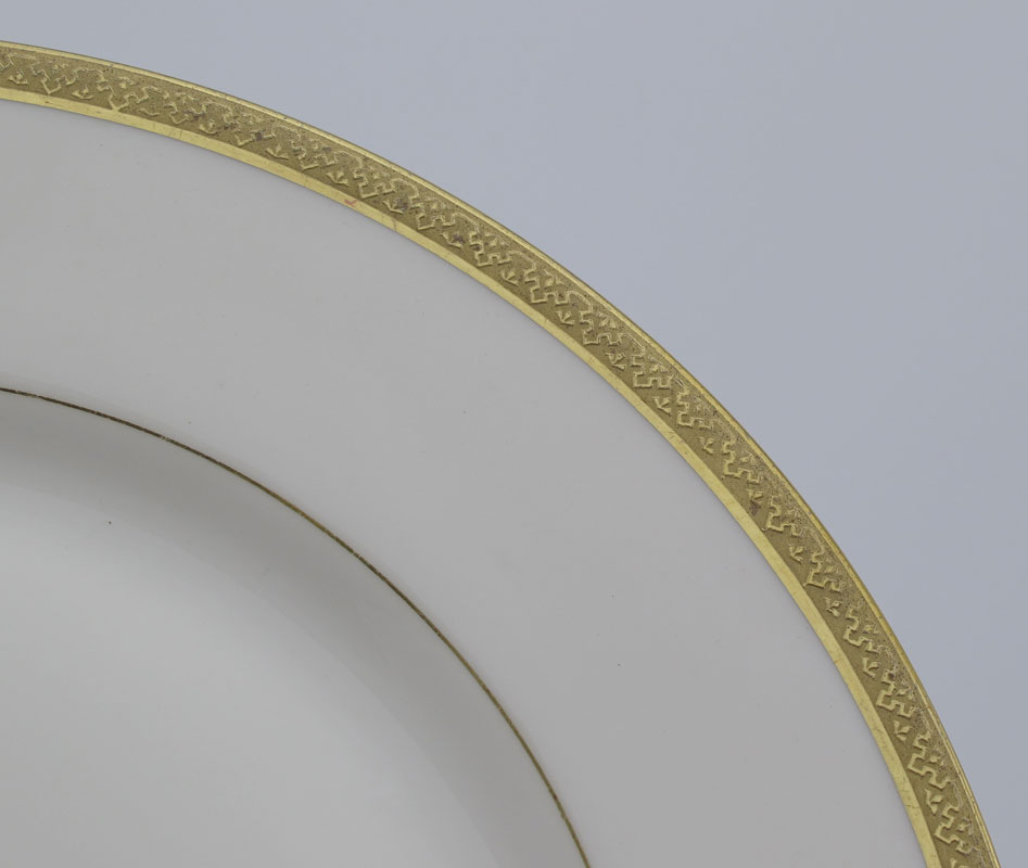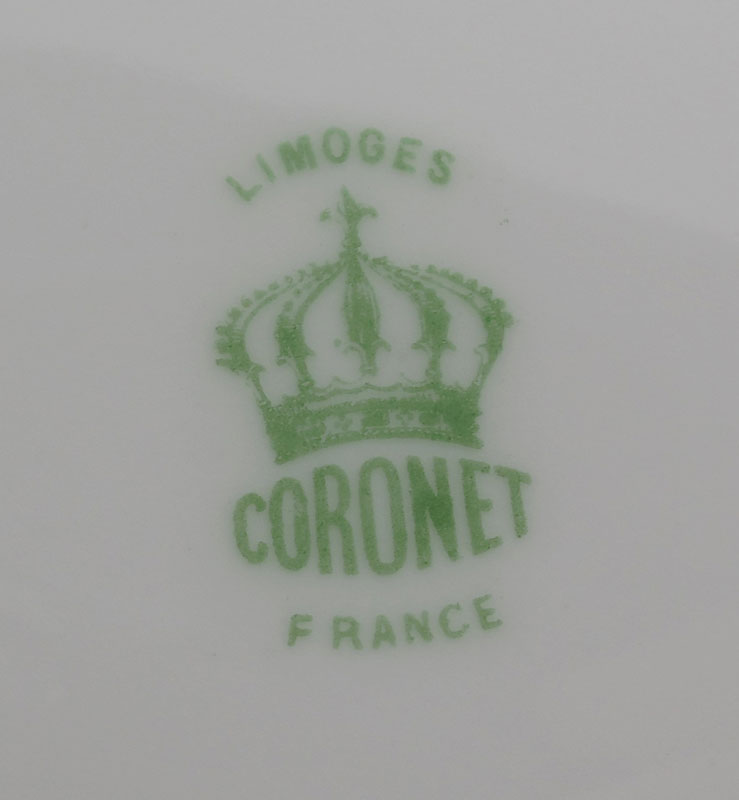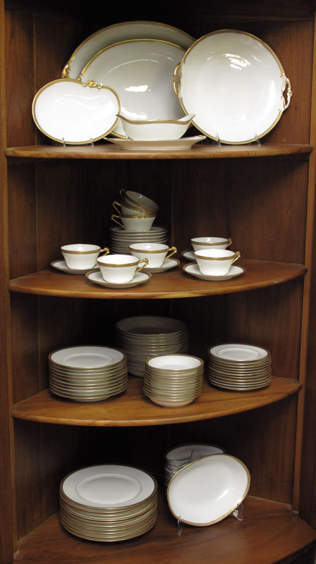 CORONET FRENCH LIMOGES FINE GOLD RIM CHINA: Approx. 94 pieces to include 10 dinner plates, 12 bones dishes, 10 salad plates, 10 bread plates, 12 soup bowls, 12 dessert bowls, 8 cups and 14 saucers. Also relish dish, gravy, round serving plate, a 14'' platter, and a 16'' platter.