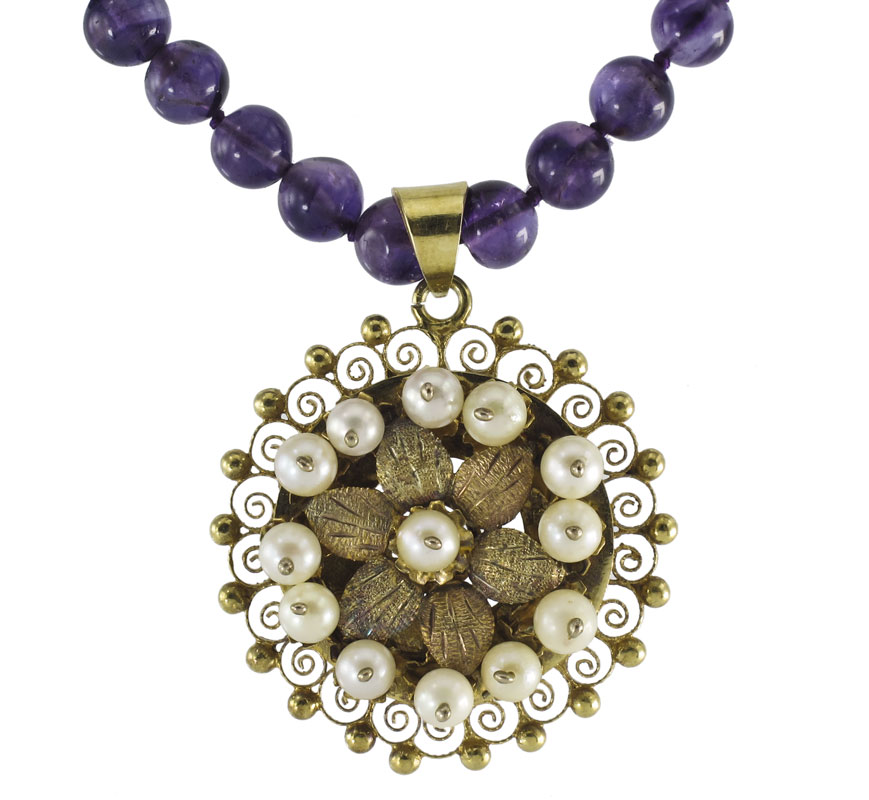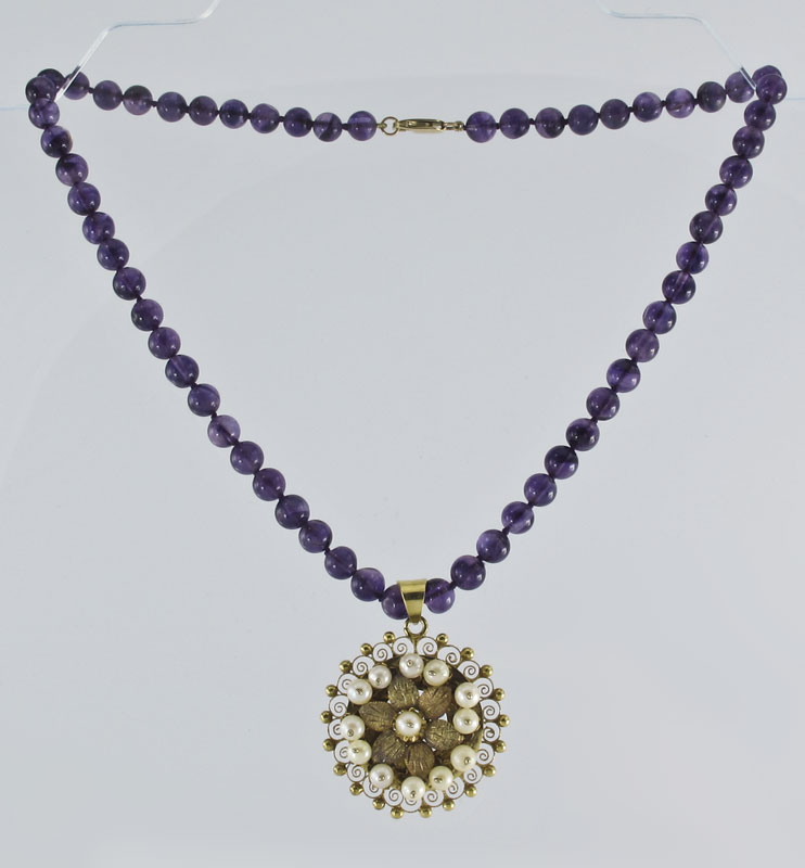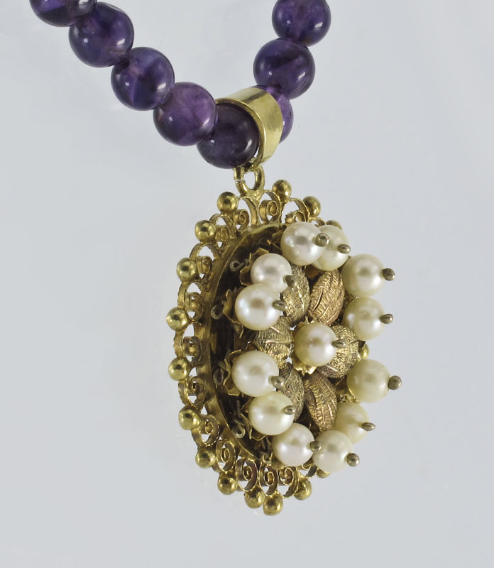 AMETHYST BEAD NECKLACE AND PEARL PENDANT: 10K yellow gold pendant with 13 cultured peals. The 18'' strand of 6.50 mm amethyst beads have a 14K clasp. Pendant Weight: 9.5 grams.