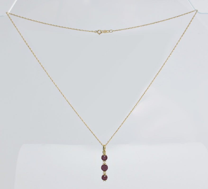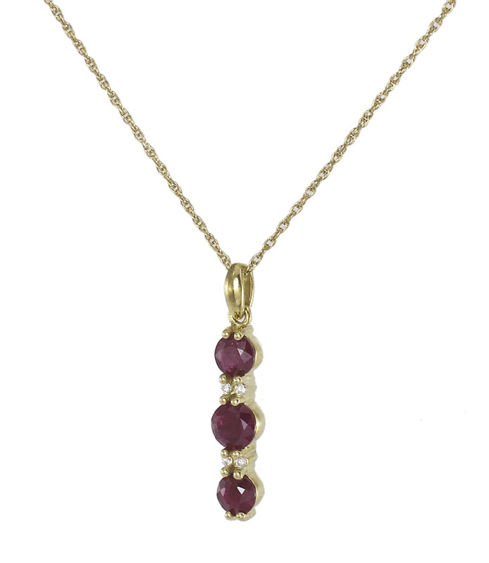 14K GOLD DIAMOND AND RUBY PENDANT NECKLACE: 14K yellow gold pendant contains 4 round brilliant cut diamonds. Weight: .04 Ct. Approx. Rated SI1 in clarity and H-I in color. Three round mixed cut rubies. Weight: 1.30 Ct. Approx. Rated SI in clarity (Type II), stpR in Hue, 5-6 in Tone and 4 in Saturation. The rubies and diamonds are prong set. 14K 18'' fine rope chain. Weight: 2.9 grams.