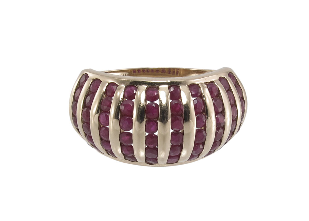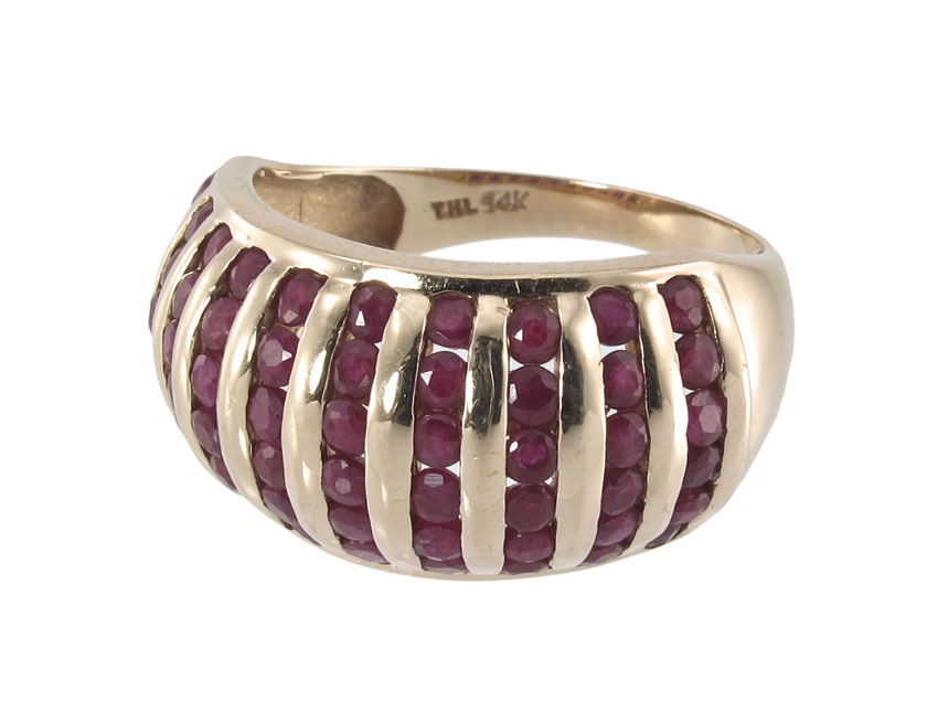 14K RUBY RING: 14K yellow gold ring contains 60 round mixed cut rubies. Weight: 2.50 Ct. approx. The rubies are channel set. Weight: 6.8 grams. Size: 9