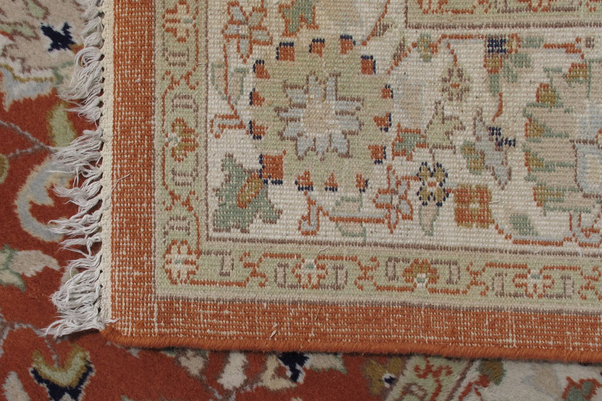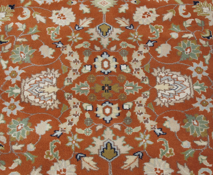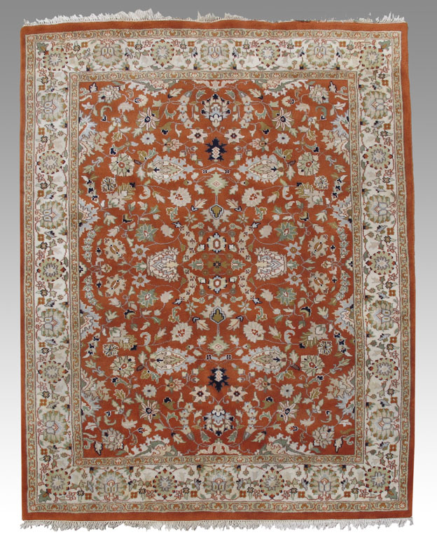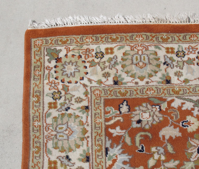 INDO PERSIAN HAND KNOTTED WOOL ROOM SIZE RUG, 8' 1'' x 9' 11'': This brightly colored rug has an overall design of flowers, vines, leaves, and palmettes like some Tabriz rugs. However the orange field color is definitely not traditional. The colors are very up to date with the pale greens, beiges, yellow, and blue/black. The main border's white ground frames the rug and completes the picture. A very ''meaty'' rug. Condition is very good.