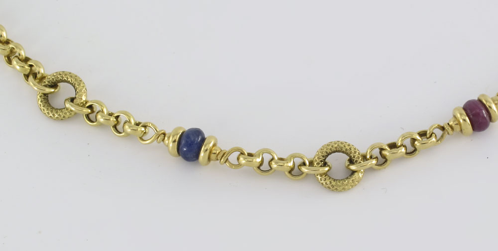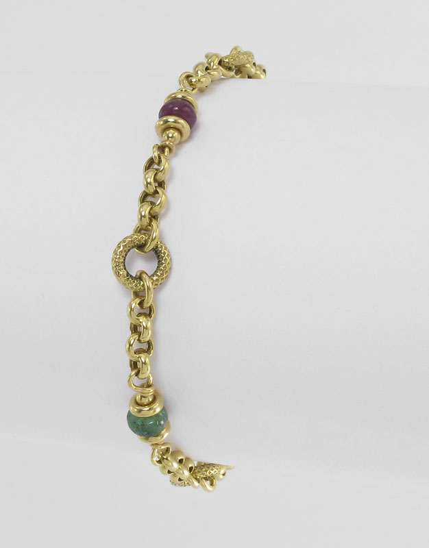 18K LINK BRACELET WITH GEMSTONES: 18K yellow gold circle link bracelet with ruby, emerald and sapphire rondelles. Weight: 8.5 grams. Length: 7'' Lobster claw clasp.