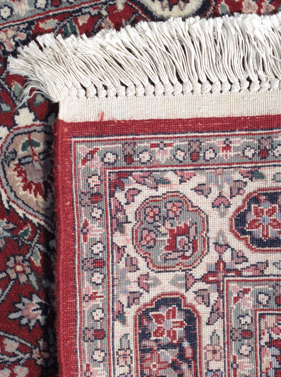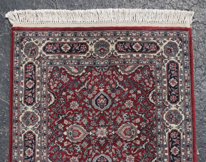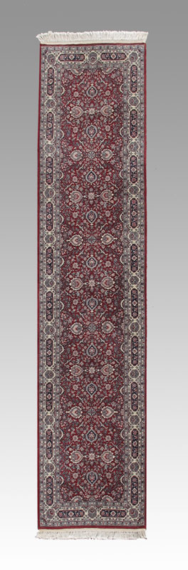 MODERN SINO-PERSIAN HAND KNOTTED WOOL RUNNER, 2' 6'' x 10' 2'': This red ground runner has a very finely woven and executed design of small palmettes linked by vines to smaller flowerheads and leaves in mostly soft colors, except for black. The white ground of the main border of the runner completes the picture of a rug that is not only good looking but would also be a durable rug for even heavy traffic. Condition is very good.