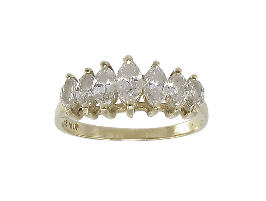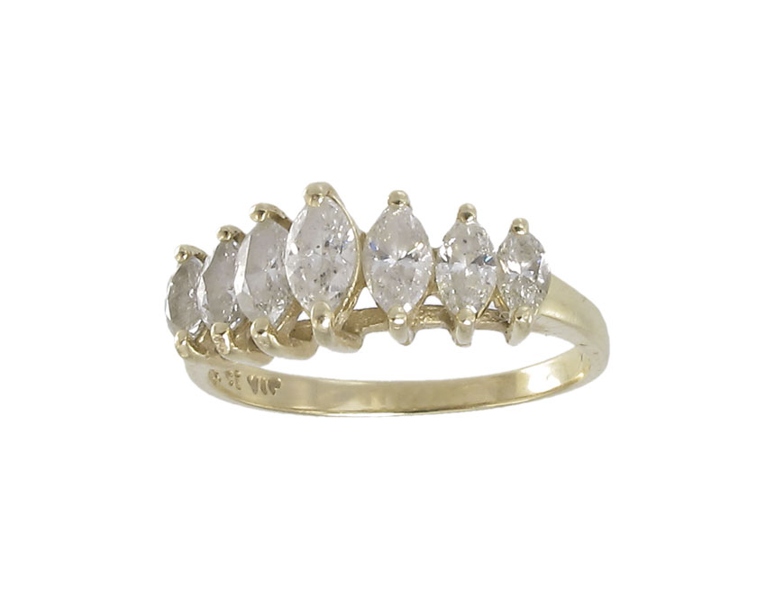MARQUISE DIAMOND RING: 14K yellow gold ring woth 7 marguise cut diamonds, all totaling approx. 1.00 Ct., rated I1 in clarity and K-L color. Prong set. Weight 2.7 grams. Size 7.