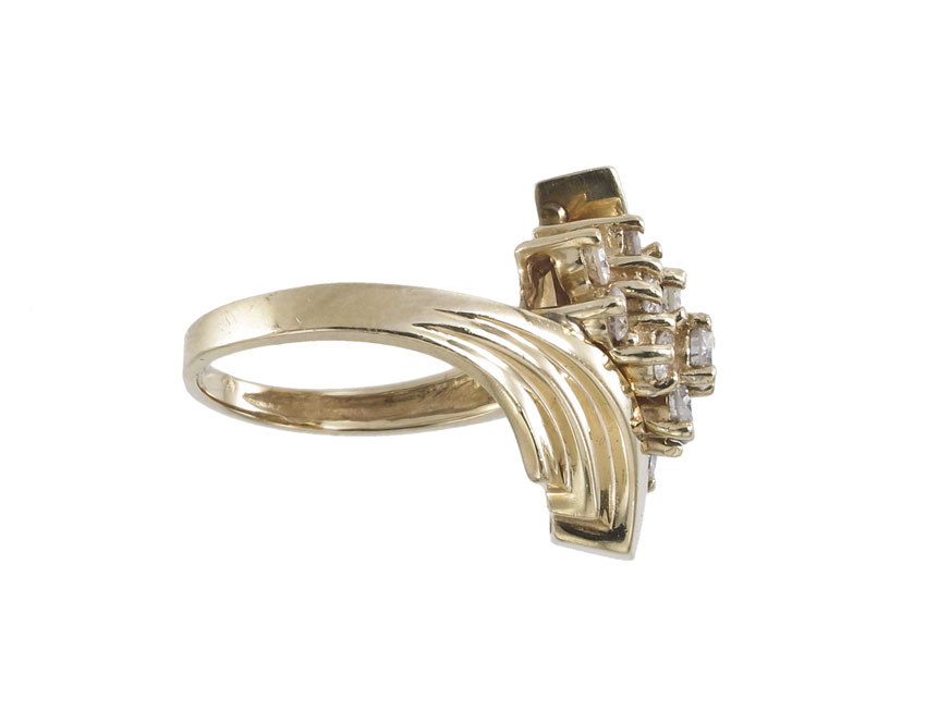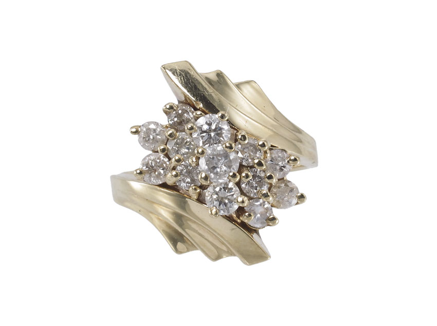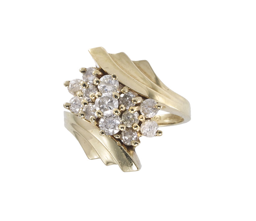 14K GOLD AND DIAMOND RING: 14K yellow gold ring contains 13 round brilliant cut diamonds, all totaling approx. 1.00 Ct. Rated I1 in clarity and I-J in color. The diamonds are prong set. Weight: 5.6 grams. Size: 6.5
