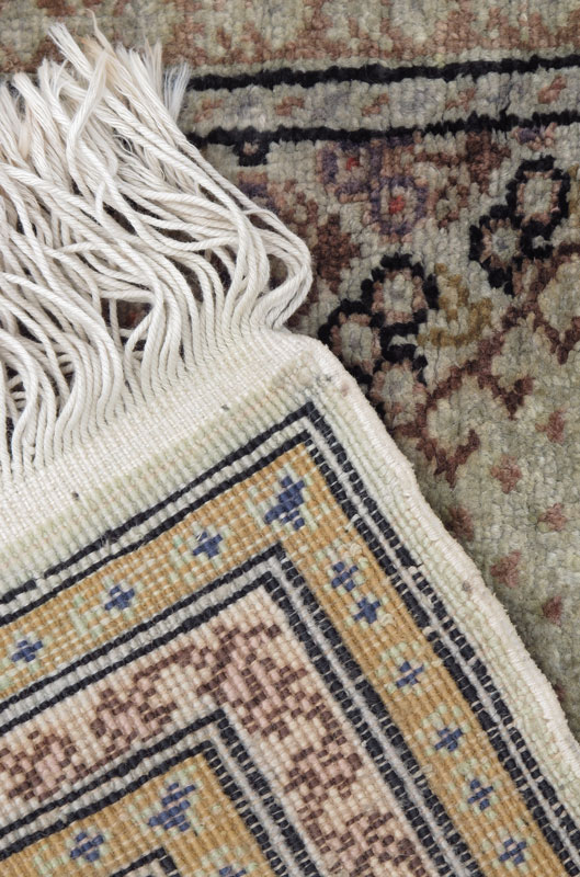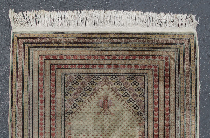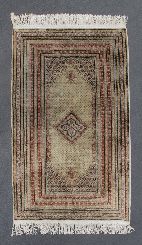 MODERN TURKISH HAND KNOTTED SYNTHETIC SILK RUG, 3' x 4' 4'': A very neutral colored rug, mostly beiges and brown-black with highlights of pale pink and red. The rug has multiple small borders that compliment the small patterns of the field. Condition is good.