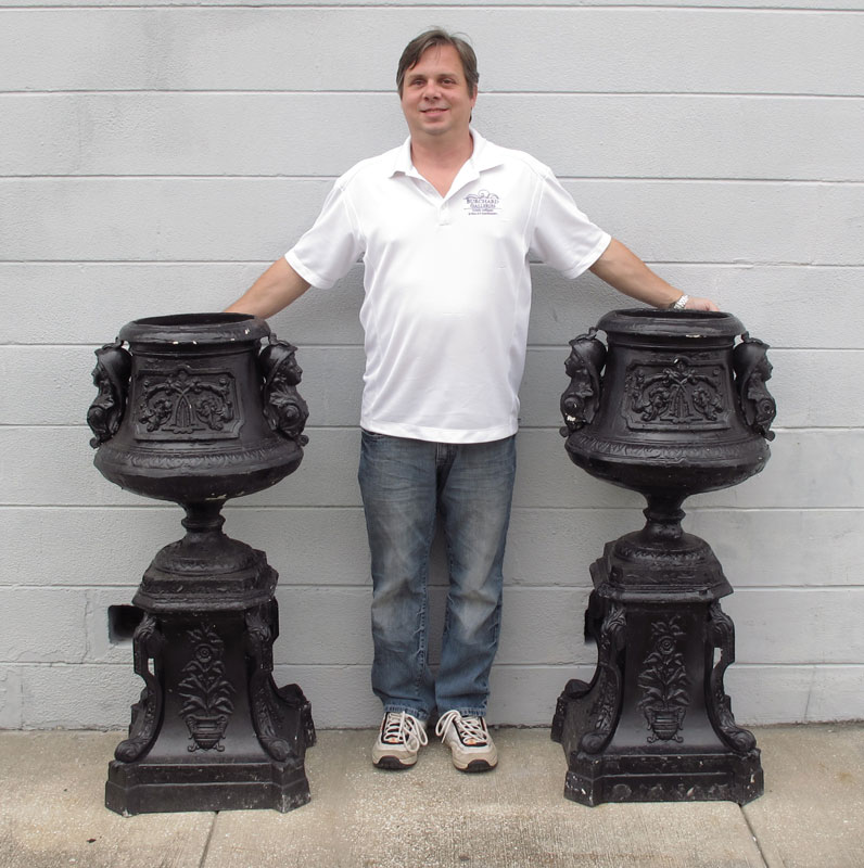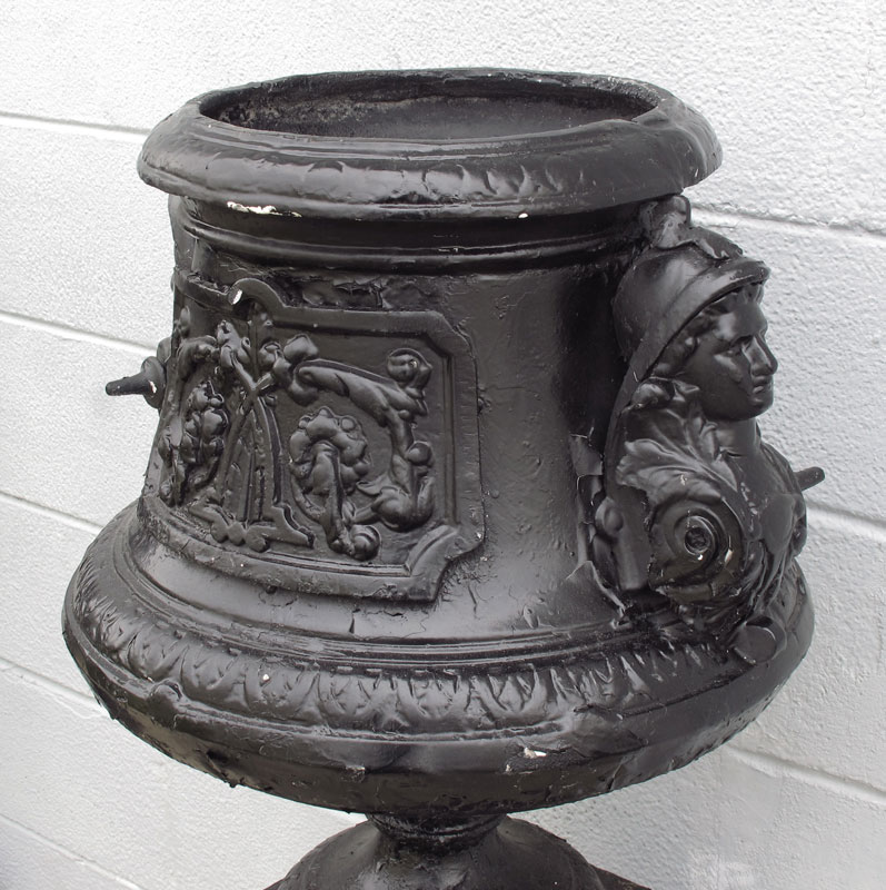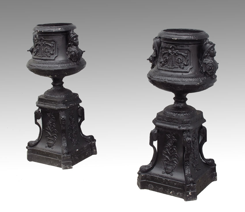 PAIR OF CAST IRON PLANTERS: Decorated with masquerons and floral motifs in panels. 43 3/4'' h. x 21 1/2'' dia.