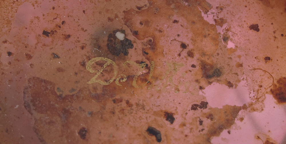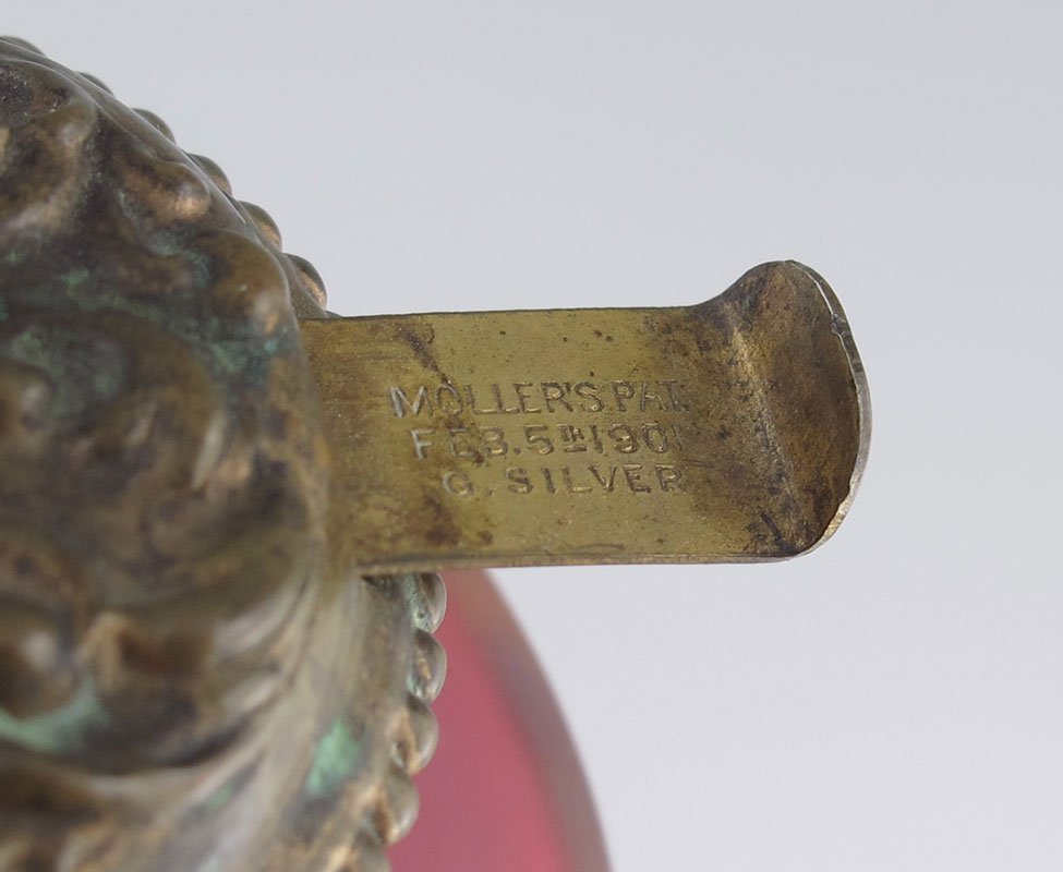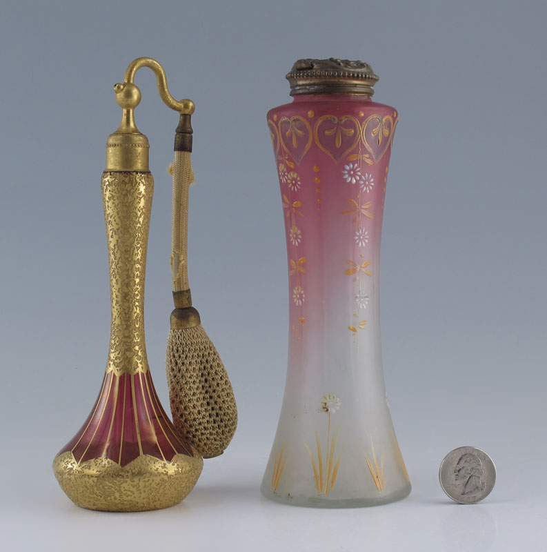 DEVILBISS ATOMIZER AND VICTORIAN ART GLASS TALC BOTTLE: To include 1) Iridescent cranberry glass and gold textured accents. Signed on base. 7 1/4'' h. 2) Floral decorated Victorian art glass talc bottle with slide closing repousse metal screw top. 7 3/8'' h. x 2 1/2'' dia.