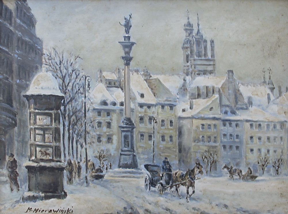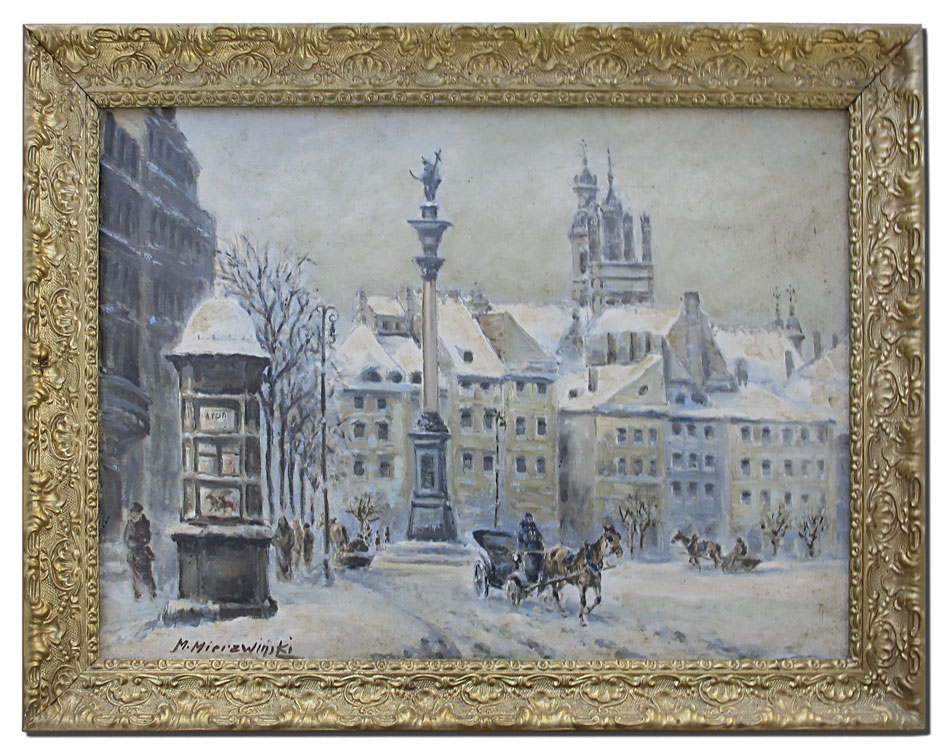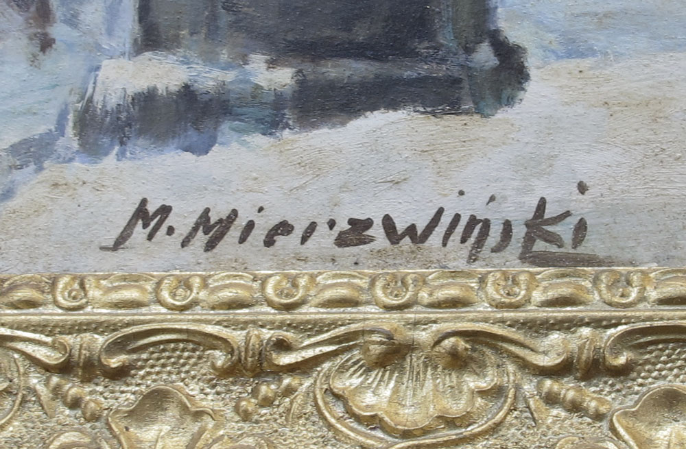 POLISH WINTER PAINTING SIGNED M. MIERZWINSKI: Winter Scene in Town Square, Oil/Board, 13 3/4'' x 19 3/4'', signed lower left, gilded frame, 16 1/2'' x 22 1/2''.