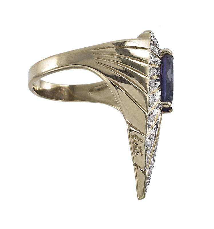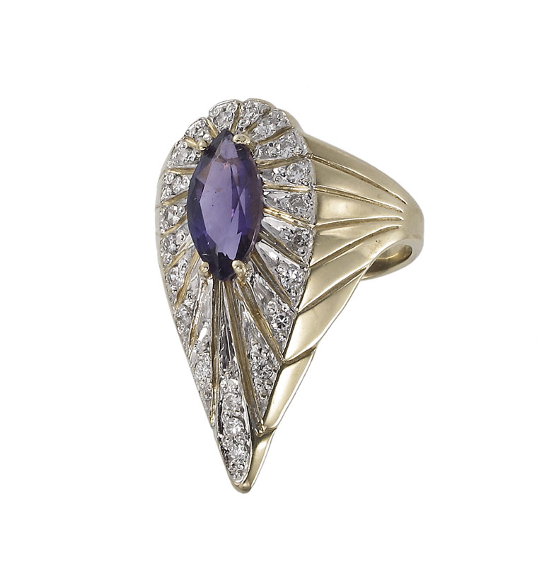 14K GOLD AND DIAMOND AMETHYST RING: 14K yellow gold ring contains one marquise cut amethyst. Weight: .85 Ct. Approx. 21 round full cut diamonds. Weight: .25 Ct. Approx. The diamonds average VS-SI in clarity and H-I in color. The amethyst is prong set. The diamonds are bead set. Weight: 5.4 grams. Size: 5.5