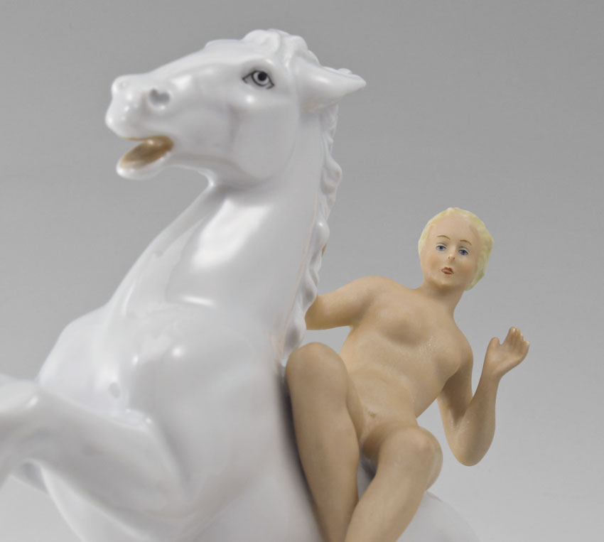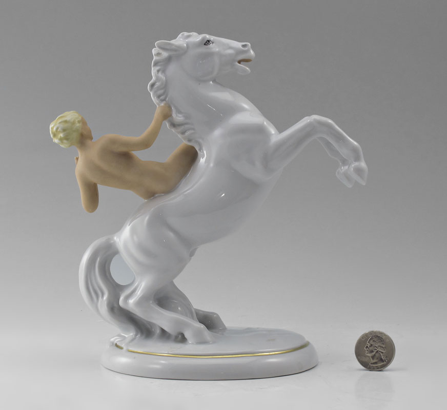 SCHAUBACH KUNST NUDE PORCELAIN FIGURE ON HORSE: Figure of a nude woman on white horse. Schauback Kunst under glaze mark. 8'' h. x 6 3/4'' x 4 1/4''.
