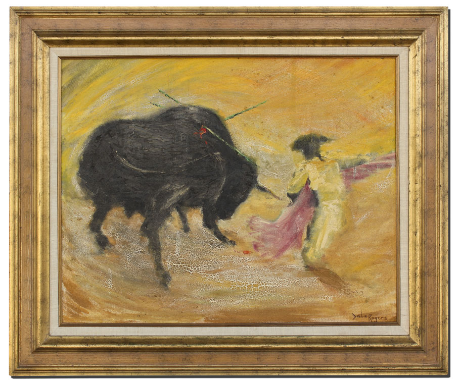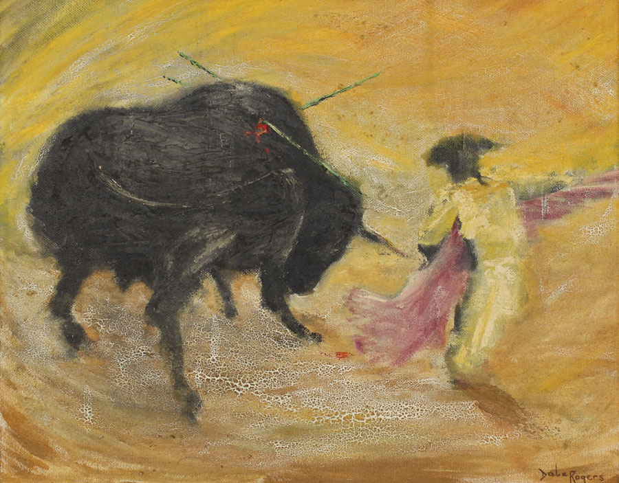 ROGERS, Dale, (American, 20th C.): ''Corrida'', Casein/Board, 22'' x 28'', signed lower right, Artist's Guild of San Francisco label affixed verso, encased in a gold frame, 30'' x 36''. Areas mostly in the bottom of the painting where the paint is congealing.