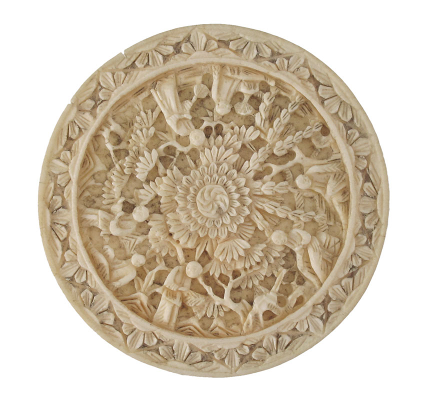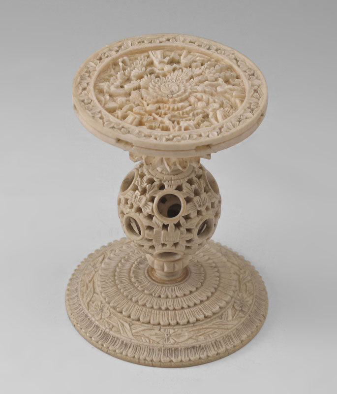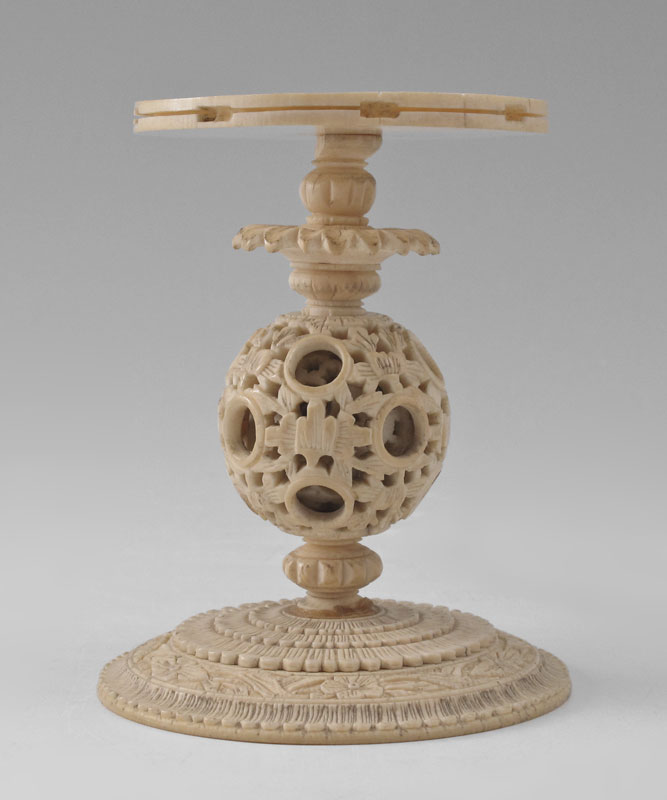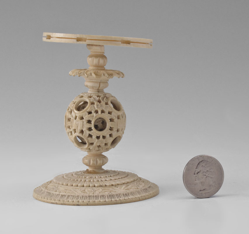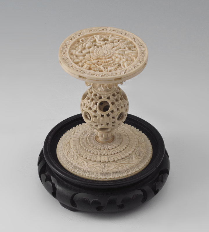 CARVED IVORY MYSTERY BALL STAND: Intricate carved top featuring figures and floral design over mystery ball over carved base. 3 3/4'' h. x 3'' dia. Sold with carved wood base, 1 1/4'' h. x 4 1/2'' dia.