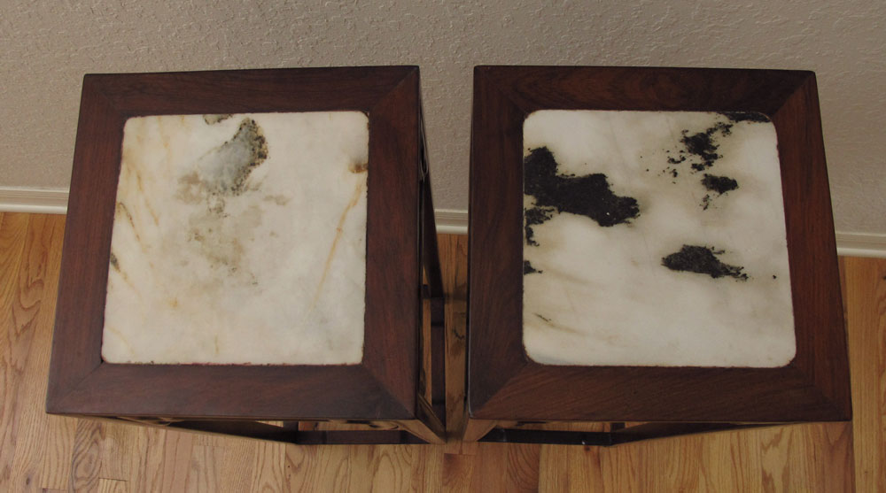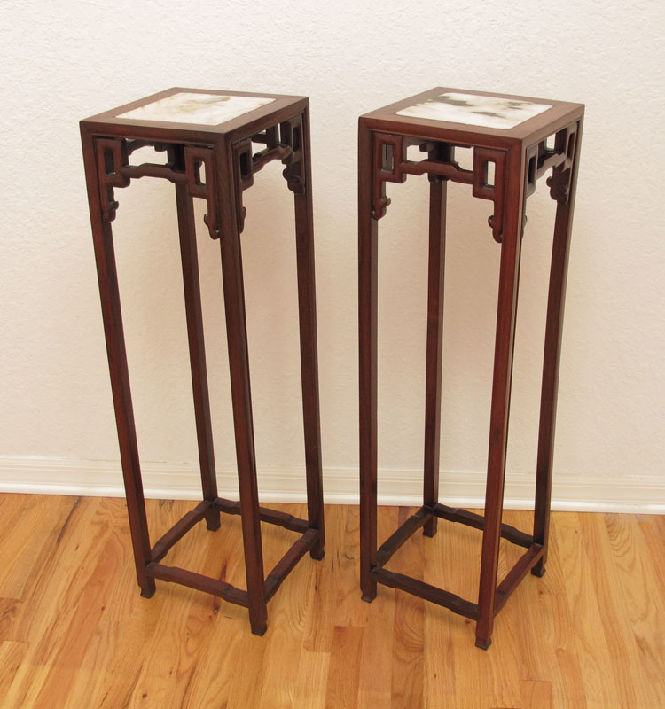 PAIR CHINESE MARBLE TOP FERN STANDS: Inset marble tops, carved and shaped bases. 38 1/4'' h. x 11'' square.