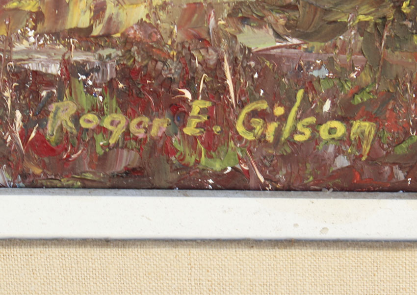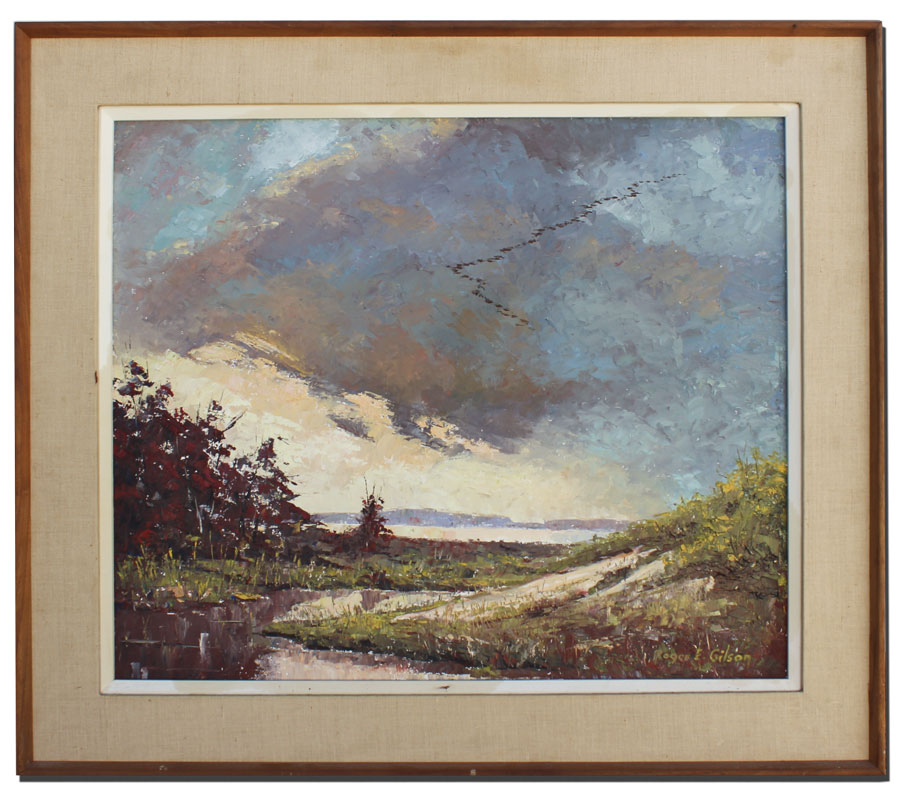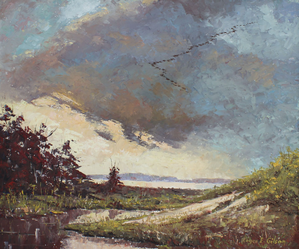 GILSON, Roger E., (American. 20TH C): Geese in Flight Over an Autumnal Lakeside Landscape, Oil/Masonite, 20'' x 24'', signed lower right, period wood frame, 26 1/2'' x 30 1/2''.
