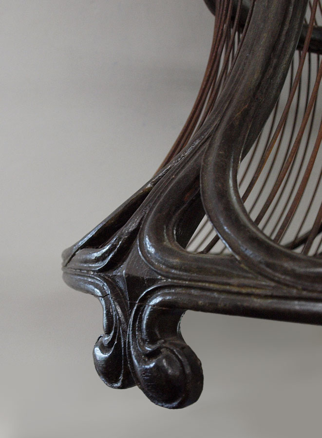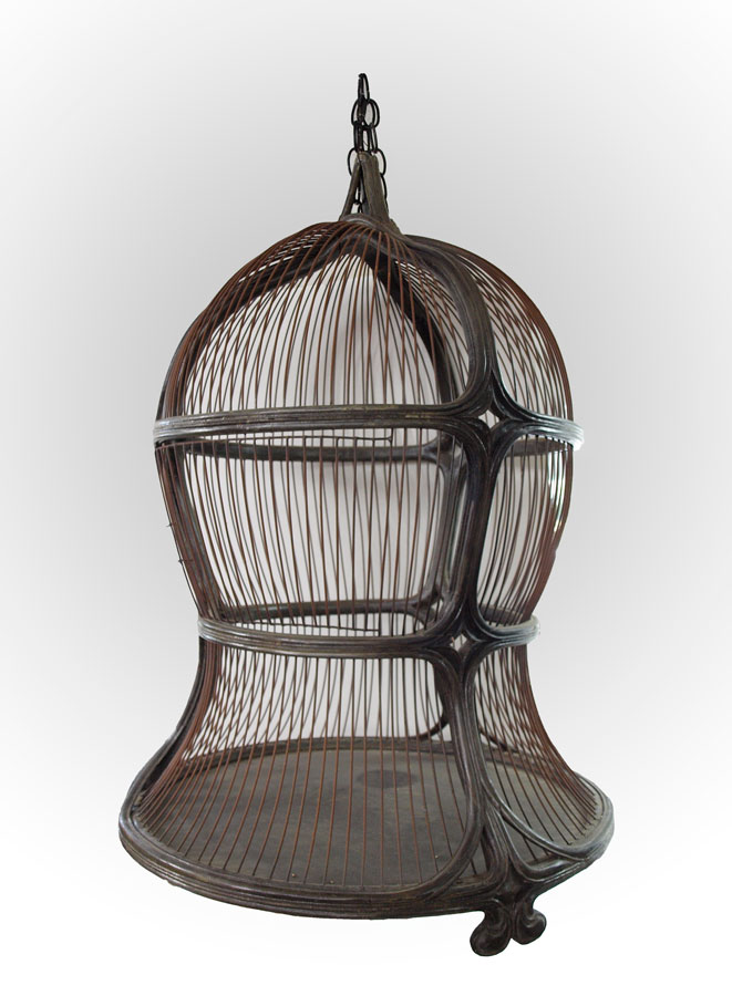 ART NOUVEAU STYLE CARVED WOOD BIRD CAGE: Carved and pierced shaped wood frame with metal cage wires, carved feet. Can also be hung from chain. 37'' h. x 23''.