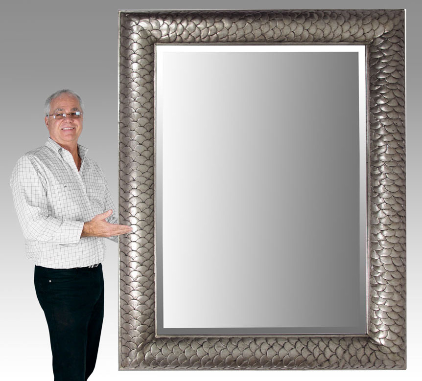 LARGE DECORATIVE SILVER GILT MIRROR: Modern fish scale design silver gilt framed with beveled glass mirror. Frame 44 3/4'' h. x 60 3/8'', mirror 32 1/2'' x 48''