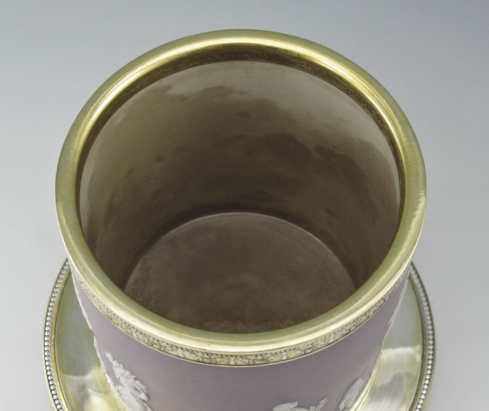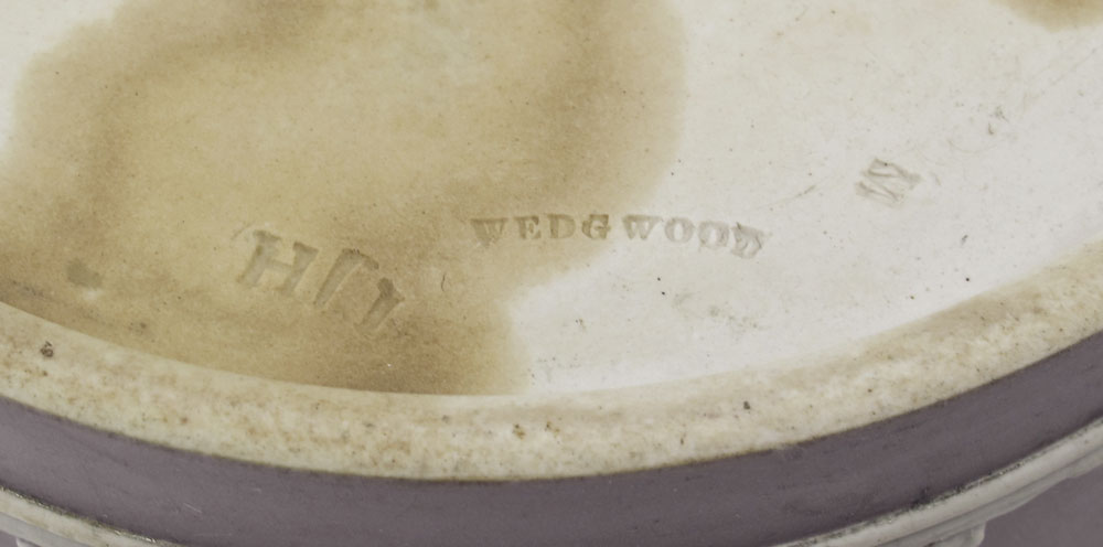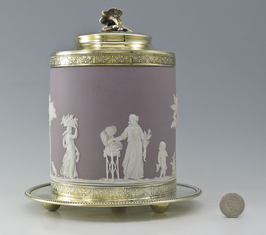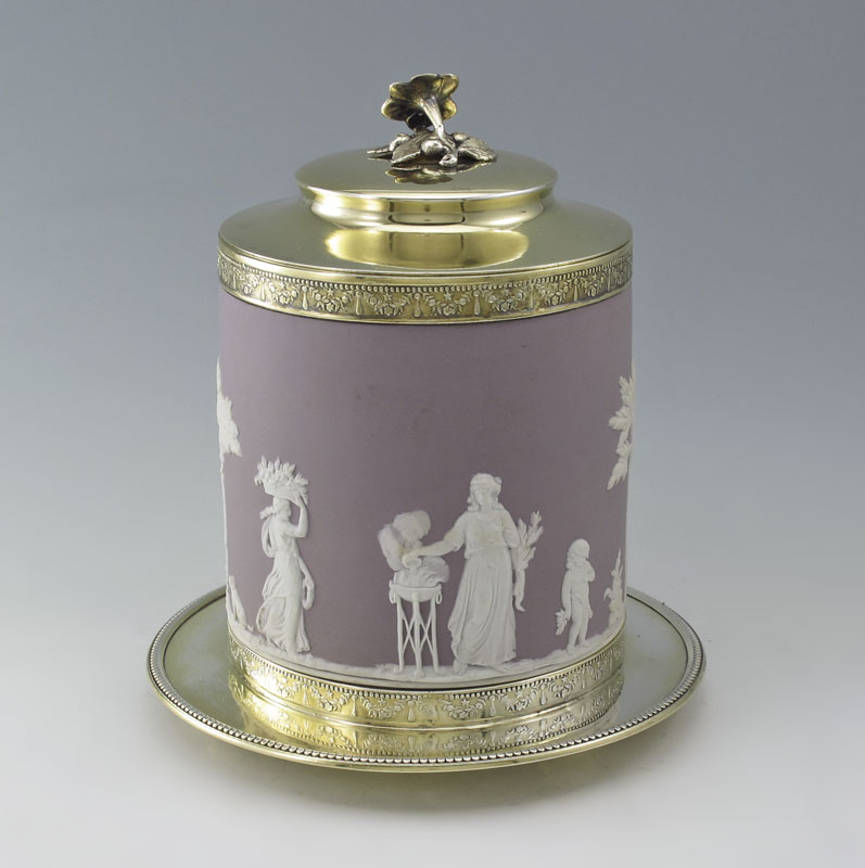 WEDGWOOD COVERED BISCUIT JAR: Purple Jasperware body with gold toned rim, lid with floral and underplate. Impressed Wedgwood. 8 1/4'' h. x 7 1/2'' dia. overall.
