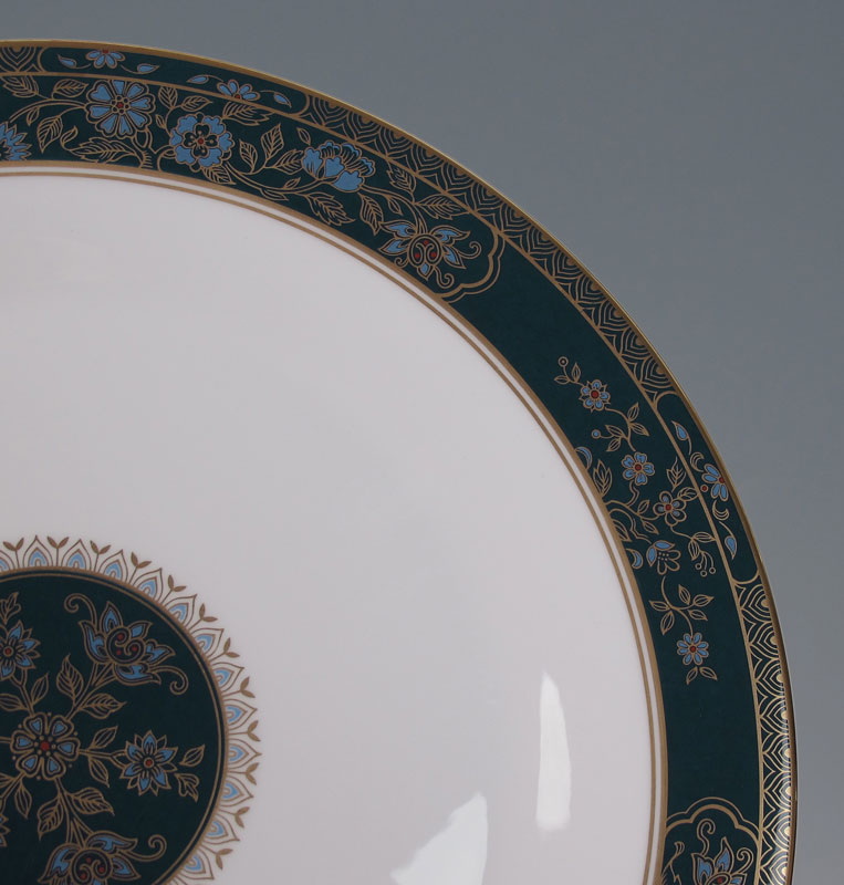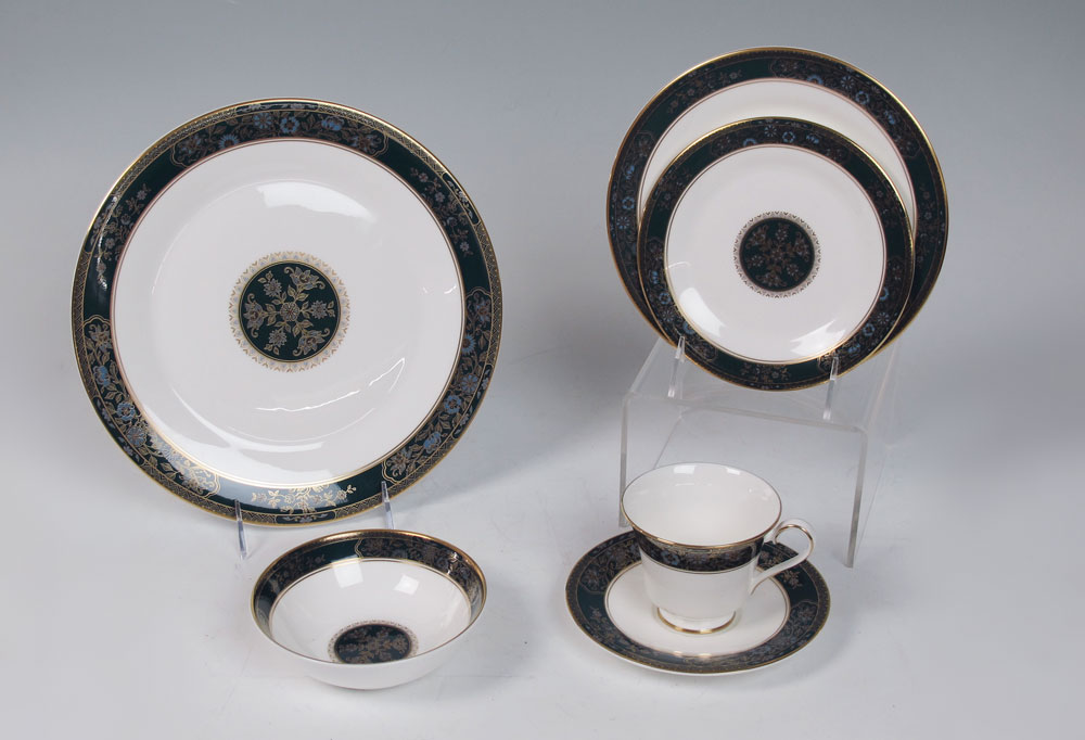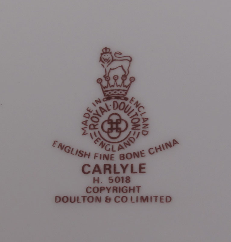 ELEGANT ROYAL DOULTON FINE CHINA IN THE CARLYLE PATTERN: Approx. 60 pieces to include 11 dinner plates. 10 salad plates, 10 bread plates, 10 dessert bowls, 10 cups and 9 saucers.
