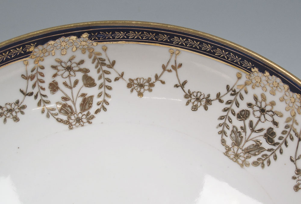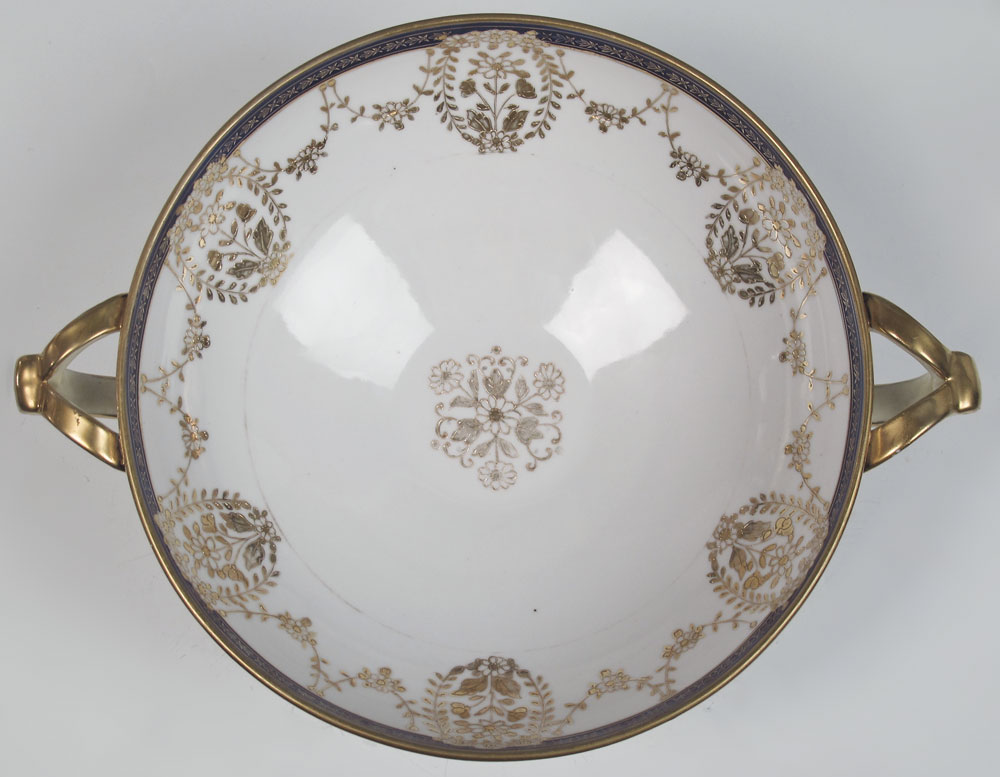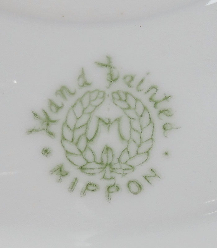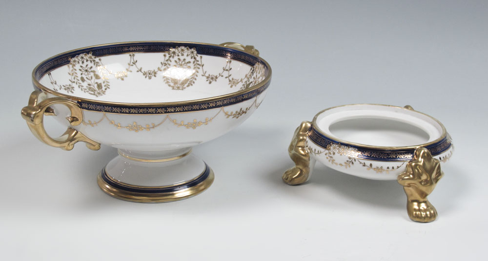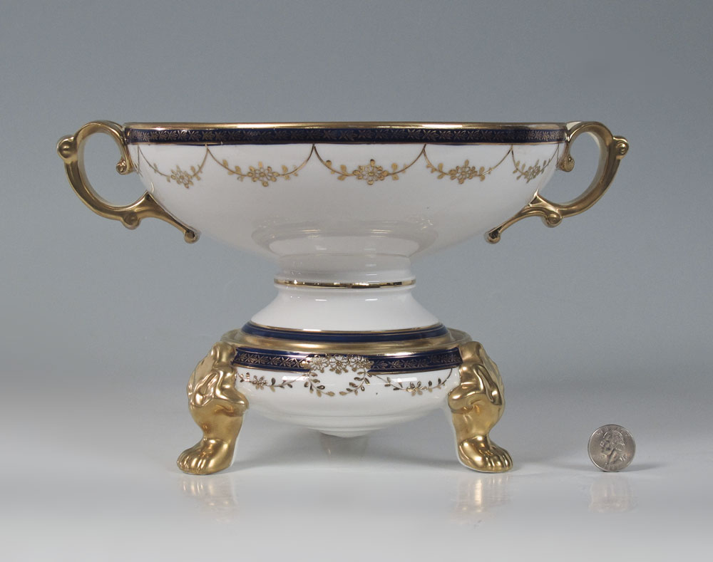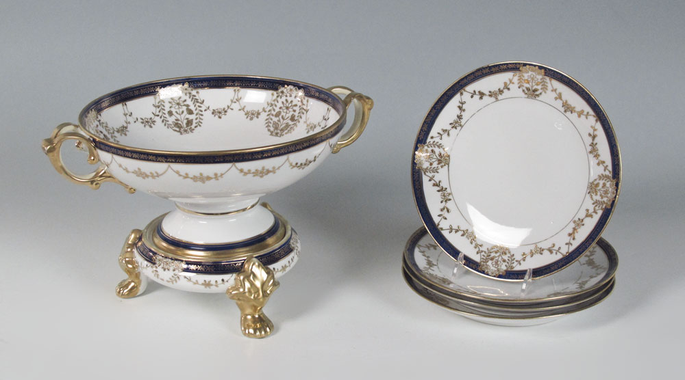 NIPPON BOWL ON STAND WITH PLATES: Gold decorated scrolled handle bowl on paw foot stand, 7'' tall overall. Sold with the 4 matching plates, 7 3/4'' dia. Murimura Bros. mark.