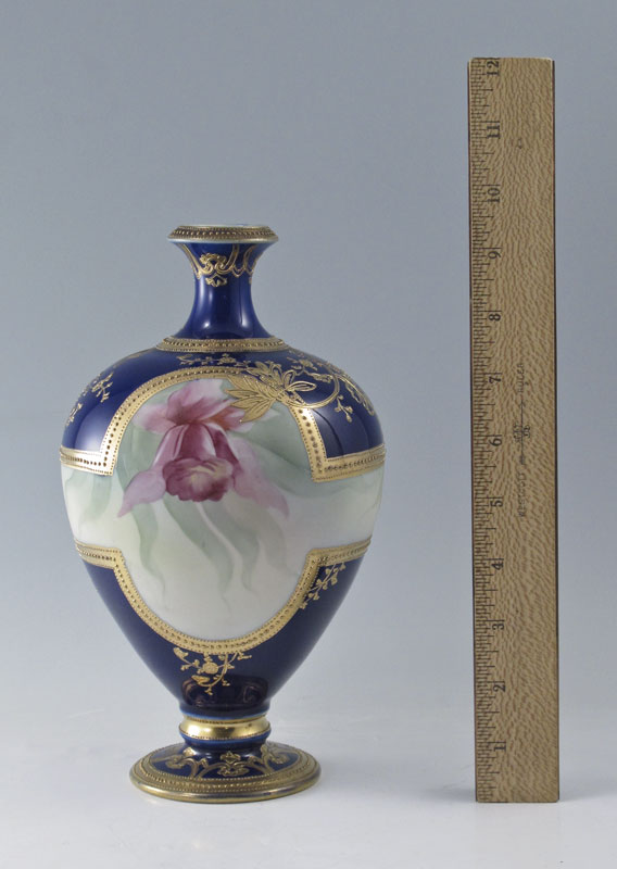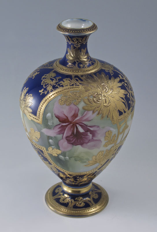 NIPPON HAND PAINTED PORCELAIN VASE: Rare orchid design centered by rich gilding on cobalt ground. Murimura Bros. wreath mark. 9 1/2''.