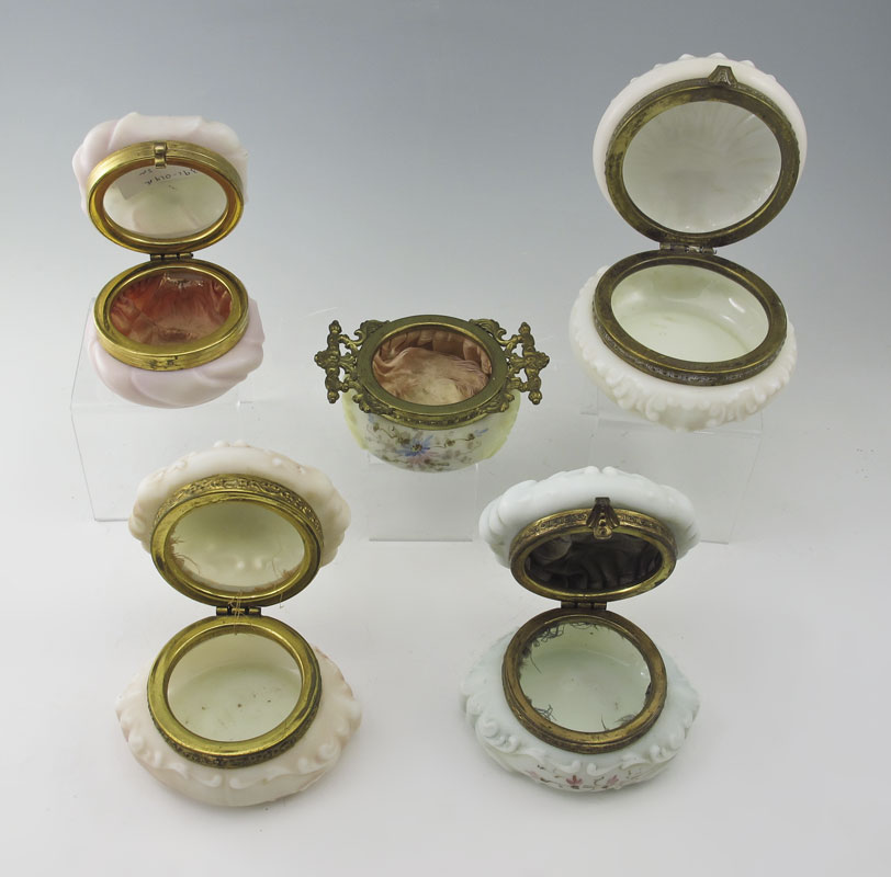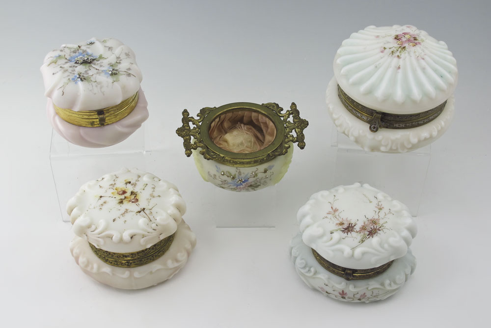 5 CF MONROE WAVECREST JARS: To include 4 hinged lid and one open double handled jars. 3 are signed. Largest measures 3'' h. x 4 1/4''.