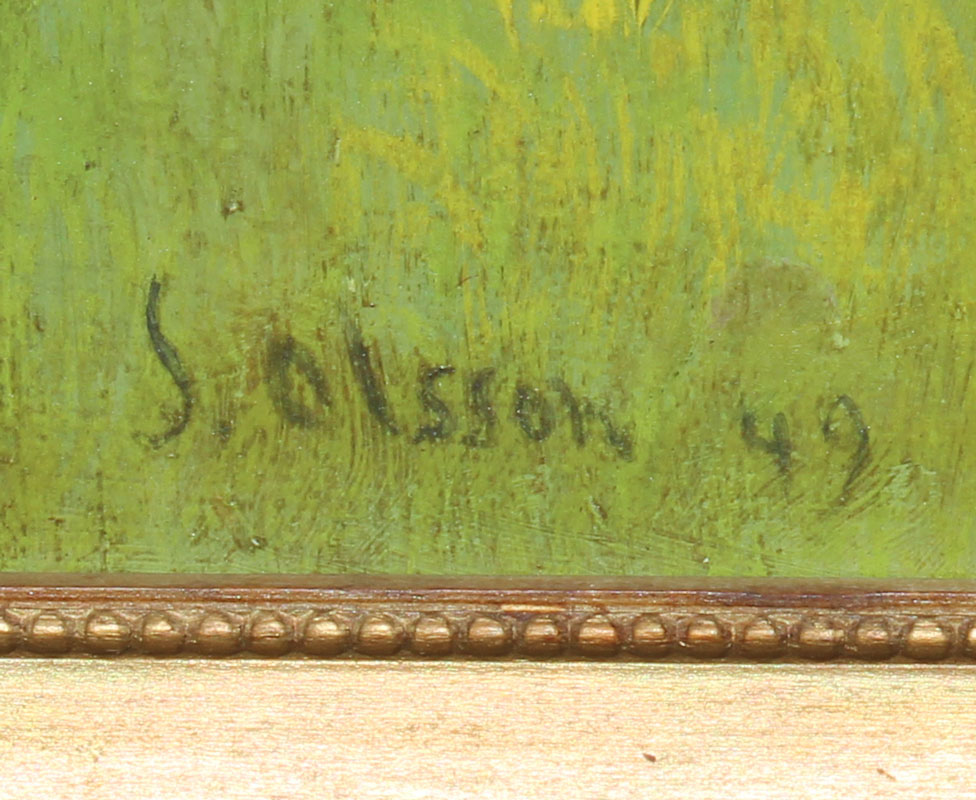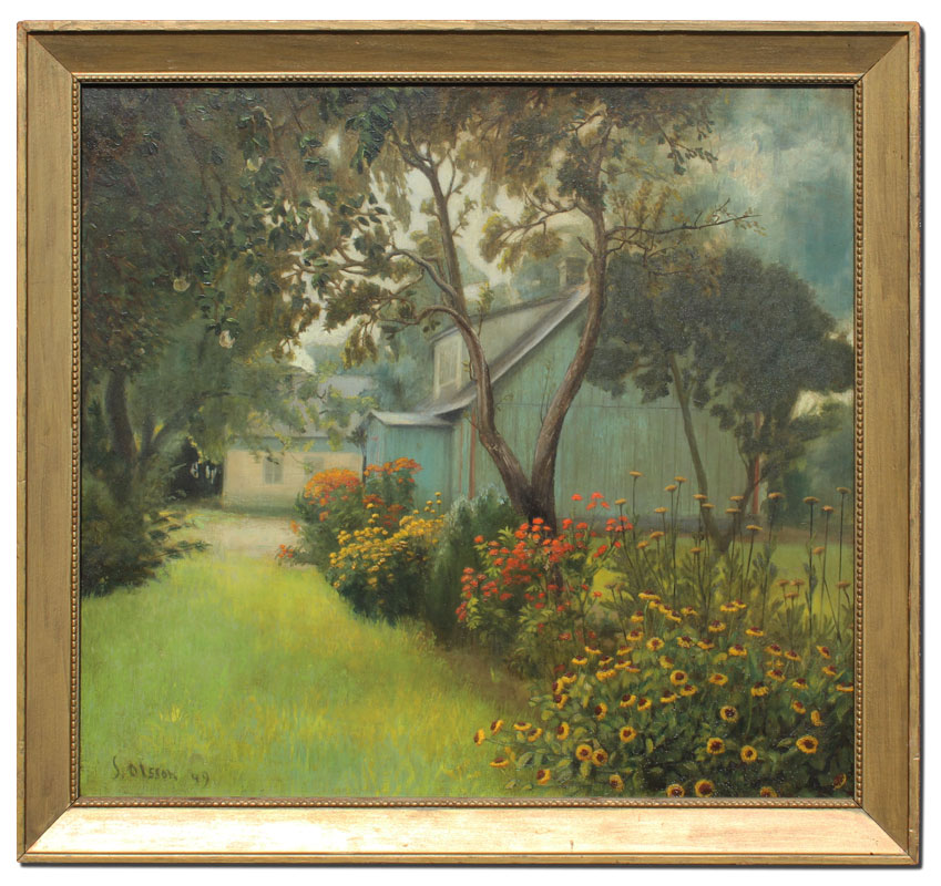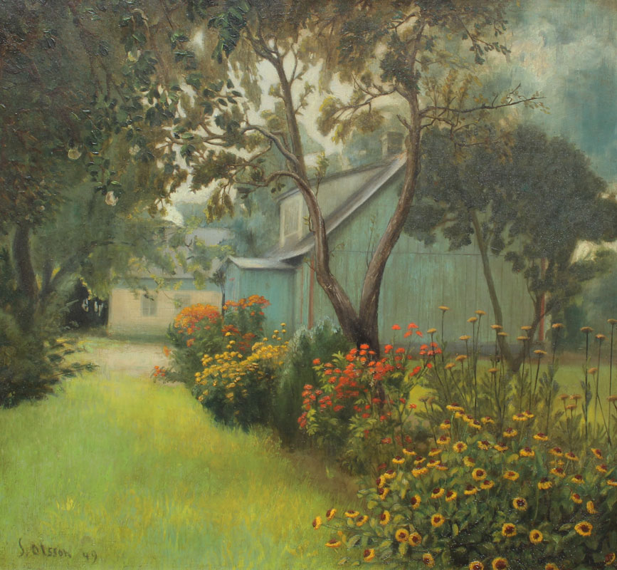 A COUNTRY GARDEN WITH BARN AND FARMHOUSE IN THE BACKGROUND: Oil/Board, 18'' x 19 1/2'', signed lower left 'S. Olsson', framed, 20 1/2'' x 22''.