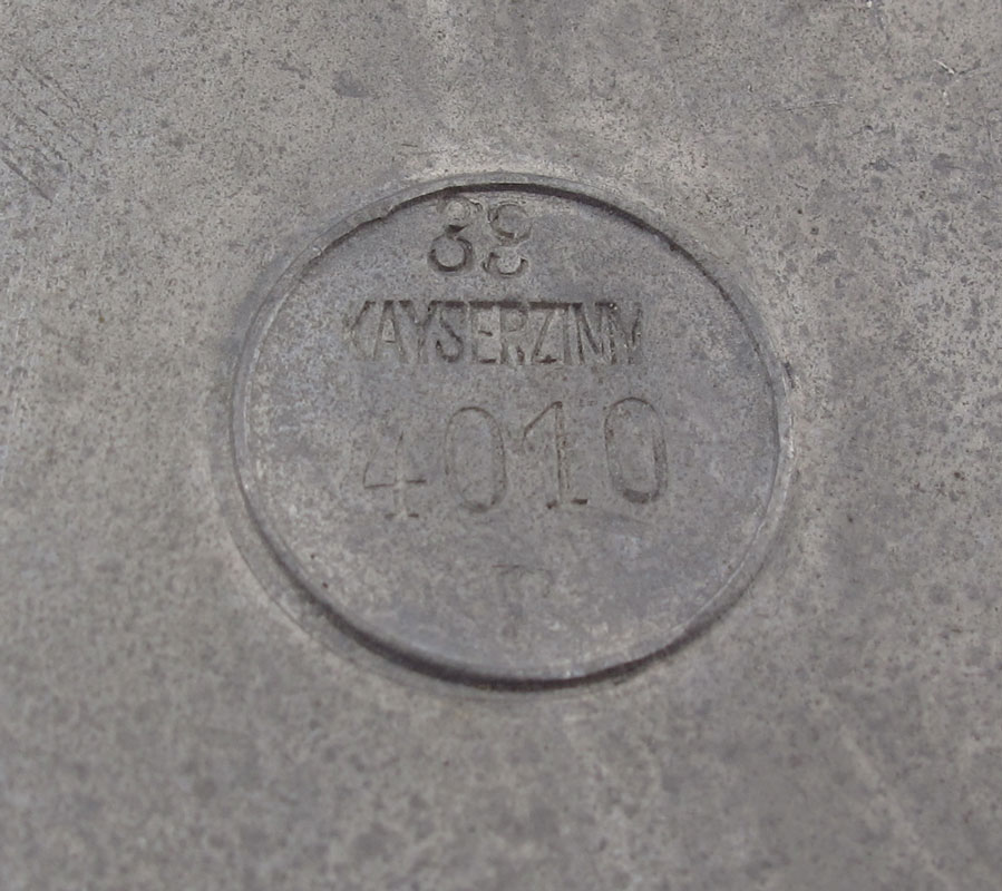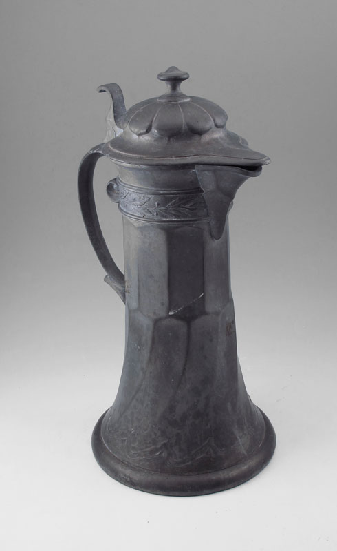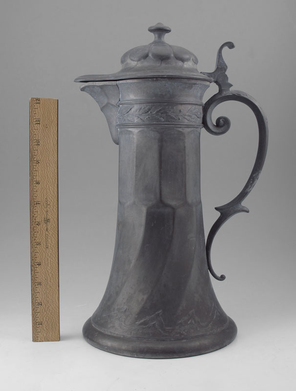 KAYSERZINN PEWTER FLAGON 4010: Hinged lid, laurel leaf embossed ring with flared base. 16'' h. x 10'' dia.