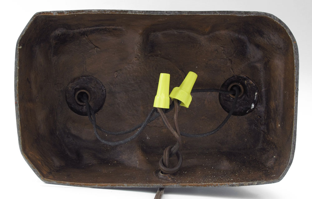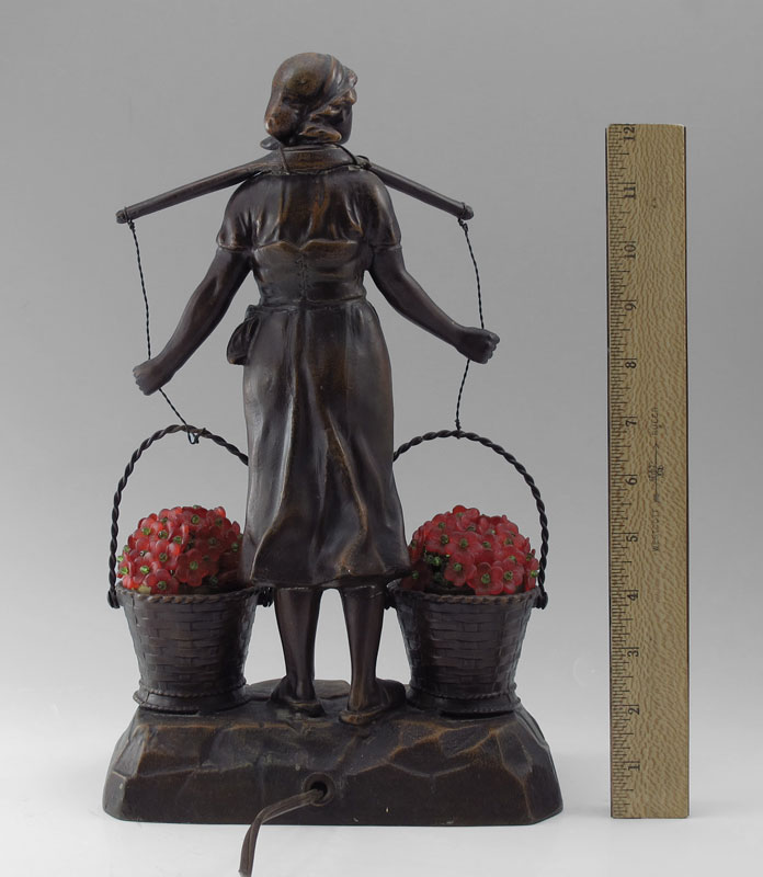 CAST METAL FIGURAL LAMP: Maiden with baskets, the light illuminates through the red glass flowers. Bronzed metal. 13'' tall x 8'' wide.