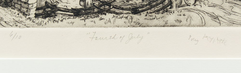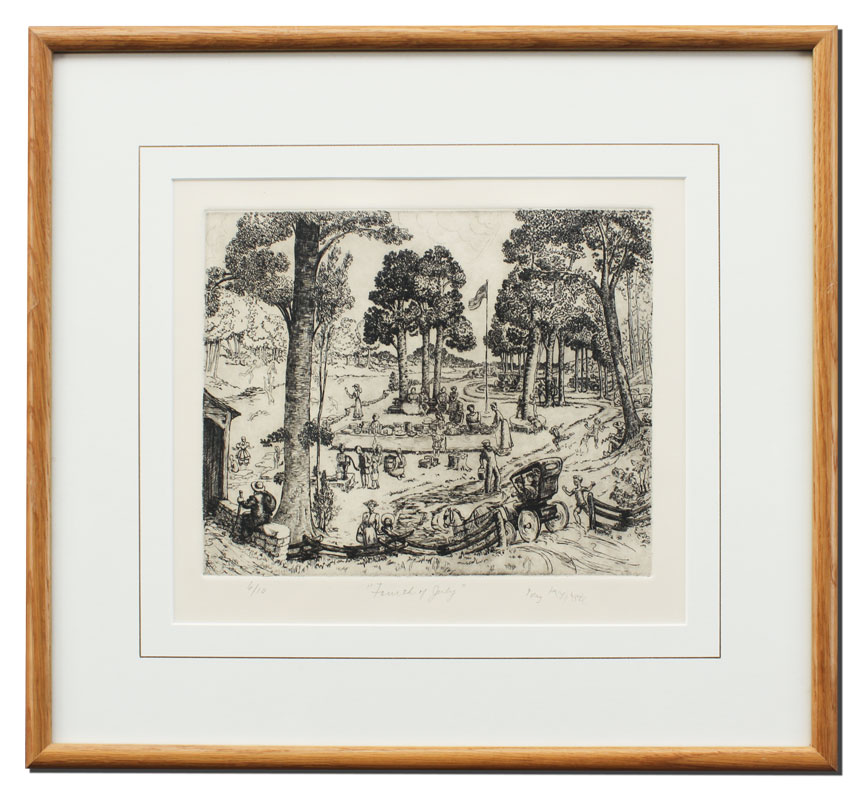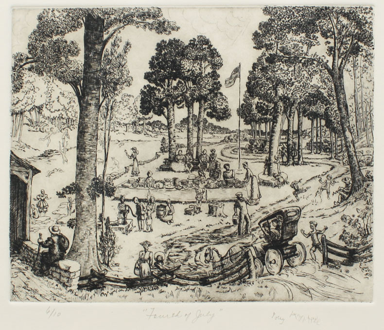 HILL, Polly Knipp, (American, 1900-1990): ''Fourth of July'', Etching, sight size 10 1/2'' x 12'', signed, titled and numbered 6/10, framed, 17 1/2'' x 19''.